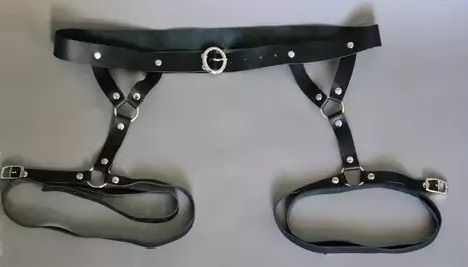 Гартеры из натуральной кожи черного цвета. Можно носить как на талии, так и на поясе. Размер универсальный, регулируется спереди застежкой пряжкой. Ниже идет длинный ремень, которым обматывается нога и застегивается на произвольной высоте пряжкой.