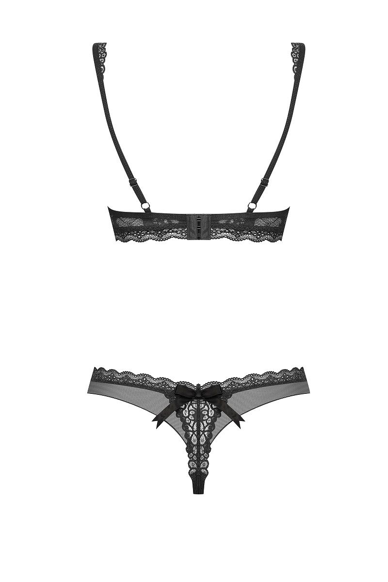 Комплект белья выполнен из эластичной сеточки в сочетании с кружевом. В комплекте: бюстгальтер, трусики-стринги.