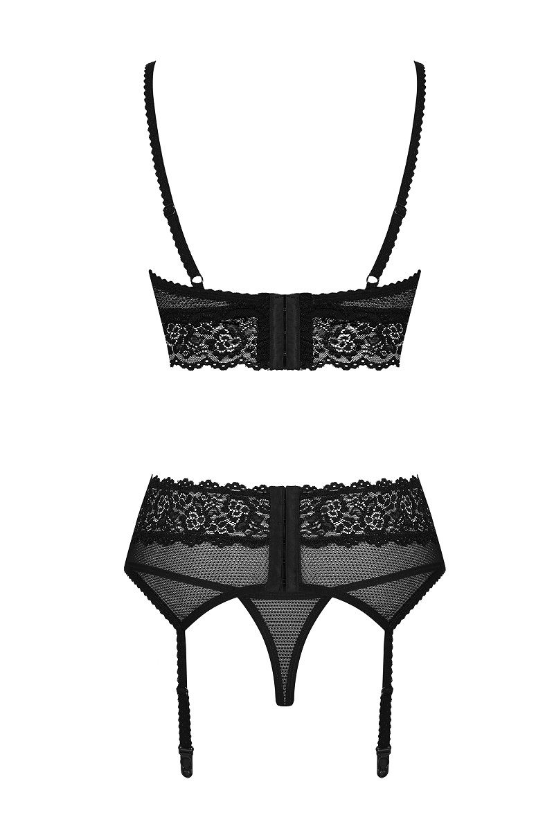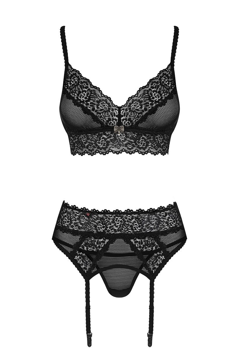 Комплект белья (бюстгальтер, пояс, трусики-стринги) выполнен из эластичной сеточки в сочетании с кружевом. В комплекте: бюстгальтер, пояс, трусики-стринги.