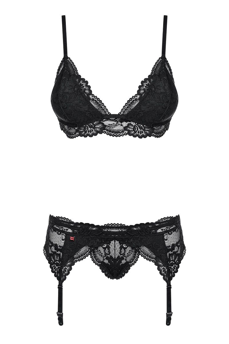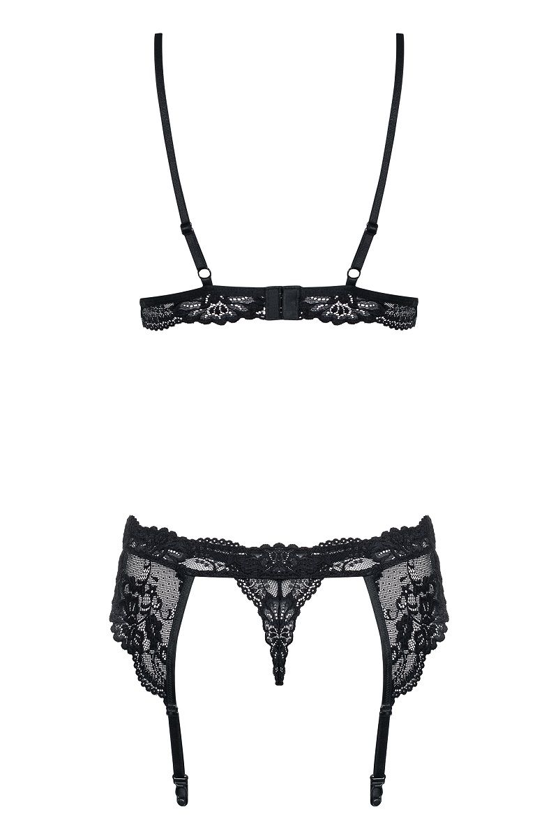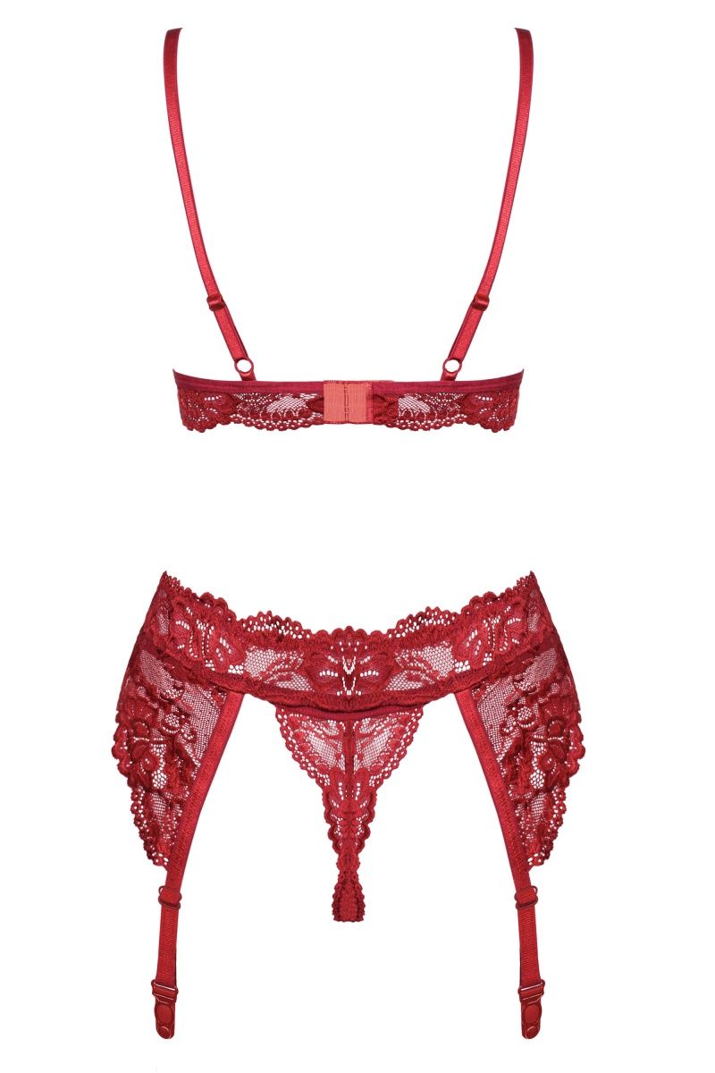 Кружевной комплект: бюстгальтер, чашка мягкая, пояс для чулок и трусики. В комплекте: бюстгальтер, трусики-стринги, пояс.