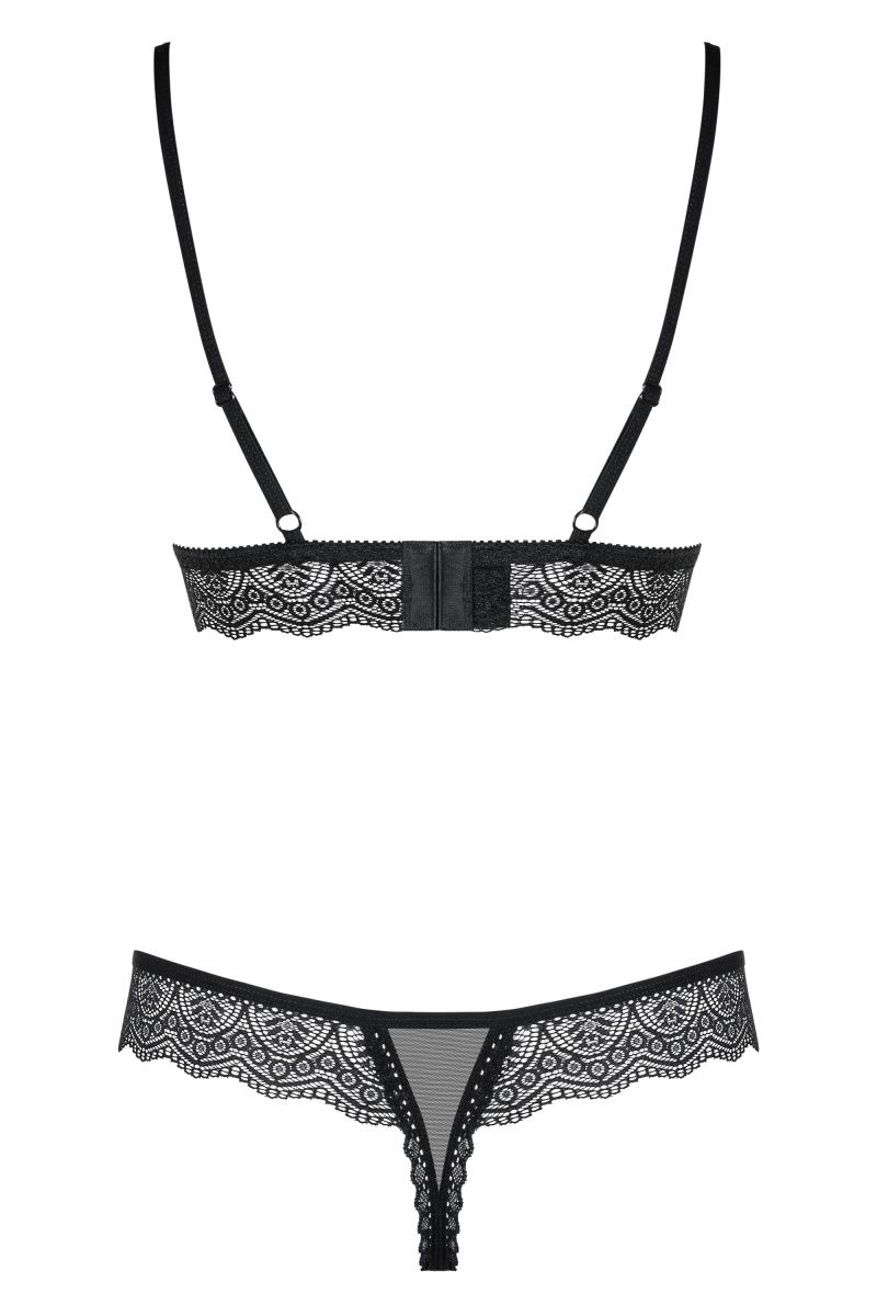 Эротический комплект белья состоит из бюстгальтера и трусиков. Комплект выполнен из прозрачной сеточки и кружева. Лямки регулируются по длине. В комплекте: бюстгальтер и трусики-стринги.