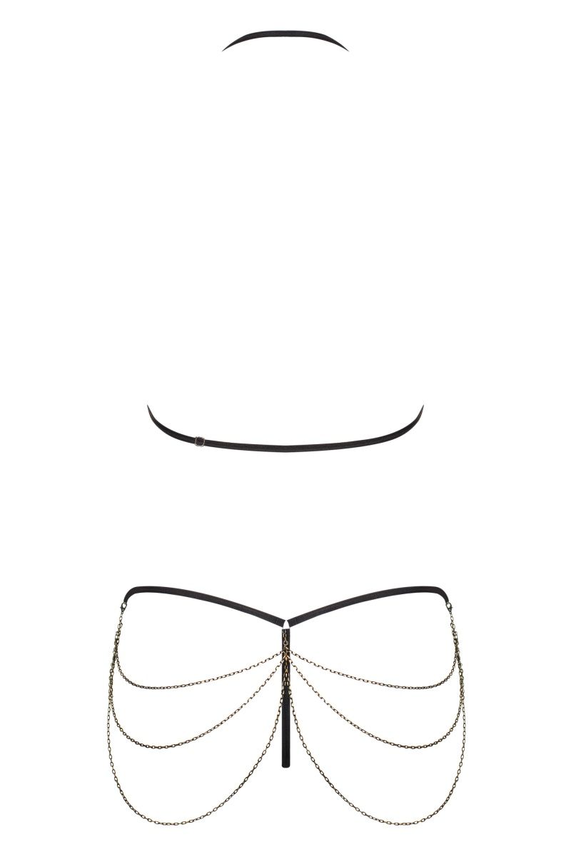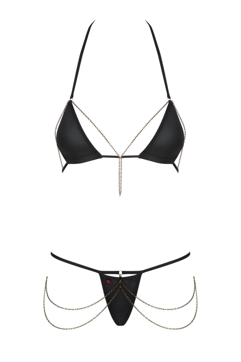 Откровенный комплект белья Redella состоит из лифа и трусиков-стрингов. Комплект выполнен из эластичной эко-кожи. Лиф мягкий без косточек, бретель фиксируется за шеей. Комплект декорирован тонкими цепочками. В комплекте: лиф, трусики-стринги.