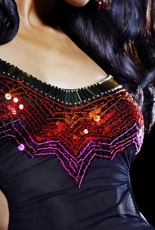 Топ из полупрозрачной ткани. Верхняя и нижняя часть декорирована пайетками. Верхняя часть декорирована пайетками. Бретели завязываются вокруг шеи. У трусиков передняя часть декорирована пайетками, трусики продублированы хлопком. В комплекте: топ, трусики.