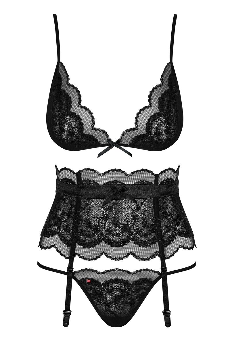 Элегантный комплект с кружевом Kisselent set. В комплекте: бюстгальтер, пояс с пажами, трусики-стринги.