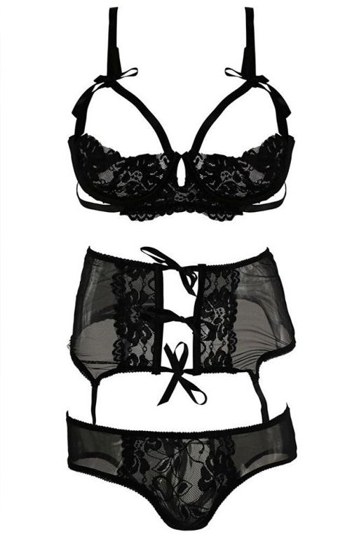 Обольстительный наряд состоит из трех деталей. Кружевной деми-бюстгальтер имеет полуоткрытые чашечки, которые красиво обрамляют грудь атласными ремешками с бантиками сверху. Бретели лифа регулируются по длине. Широкий пояс из полупрозрачной сетки спереди завязывается на атласные ленточки, оставляя открытой часть живота. Вдоль нее проходят широкие полосы цветочного кружева. Пажи для чулок регулируются по длине. Сетчатые трусики в передней части имеют кружевную вставку, сзади пикантный вырез демонстрирует ваши соблазнительные ягодицы, приправляя откровенный вид двумя завязочками. В комплекте: бюстгальтер, трусики, пояс.