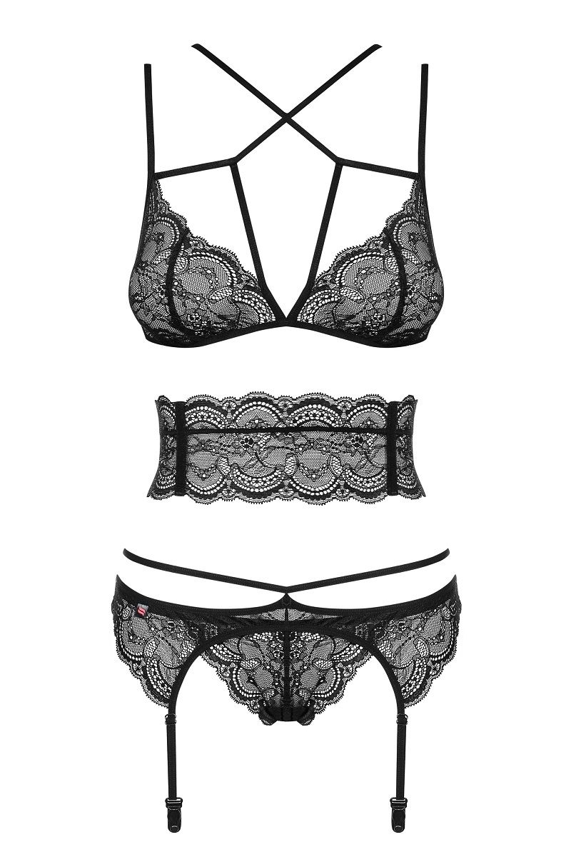 Кружевной комплект Frivolla с декоративным кружевным поясом. В комплекте: бюстгальтер, трусики-стринги, пояс с подвязками, декоративный ремень.