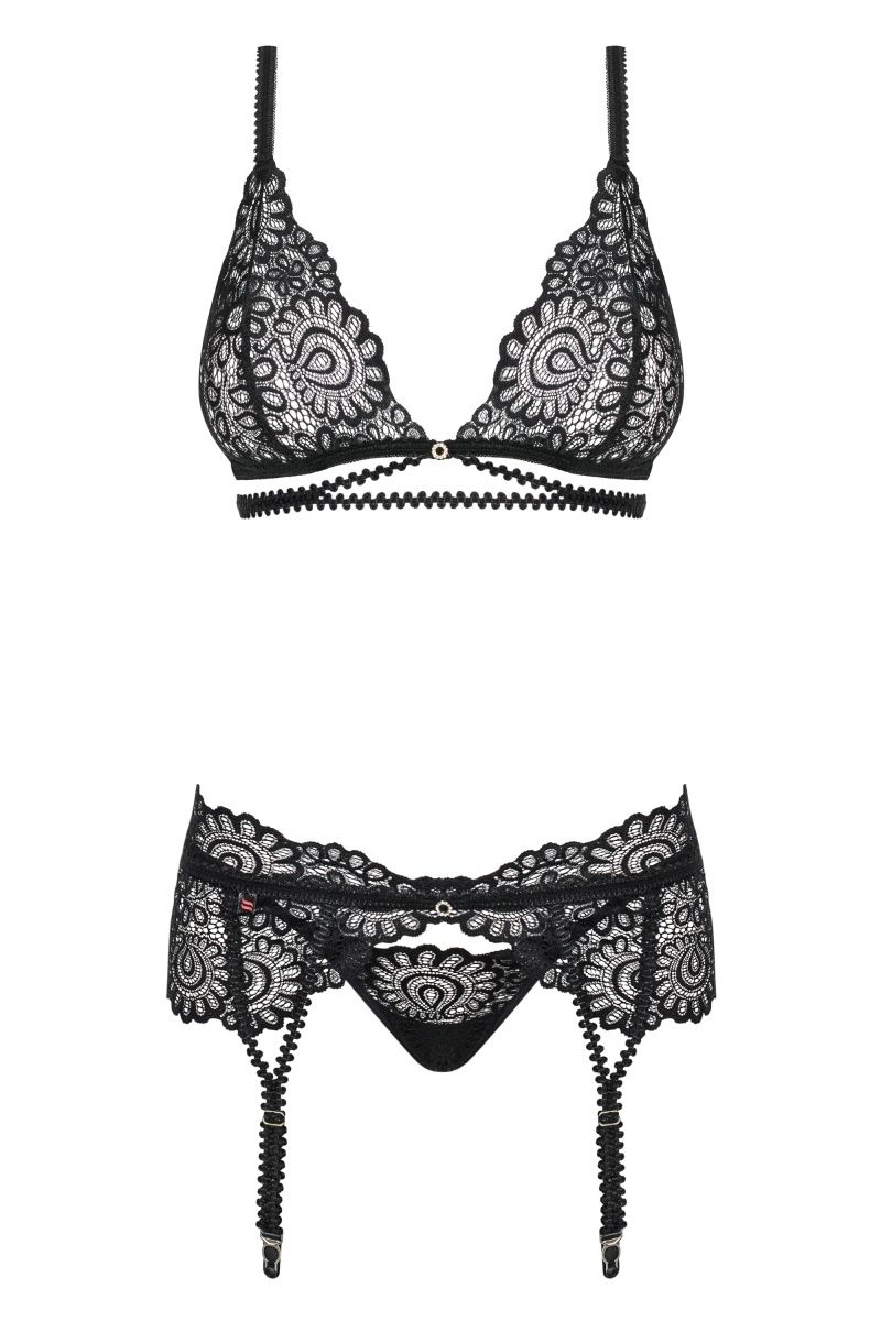 Роскошный комплект белья Mixty состоит из бюстгальтера, пояса для чулок и трусиков-стрингов. Комплект выполнен из эффектного кружева и эластичных лент. Лиф мягкий без косточек с регулируемыми бретелями и застежкой на спинке. В комплекте: бюстгальтер, пояс для чулок и трусики-стринги.