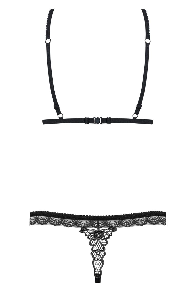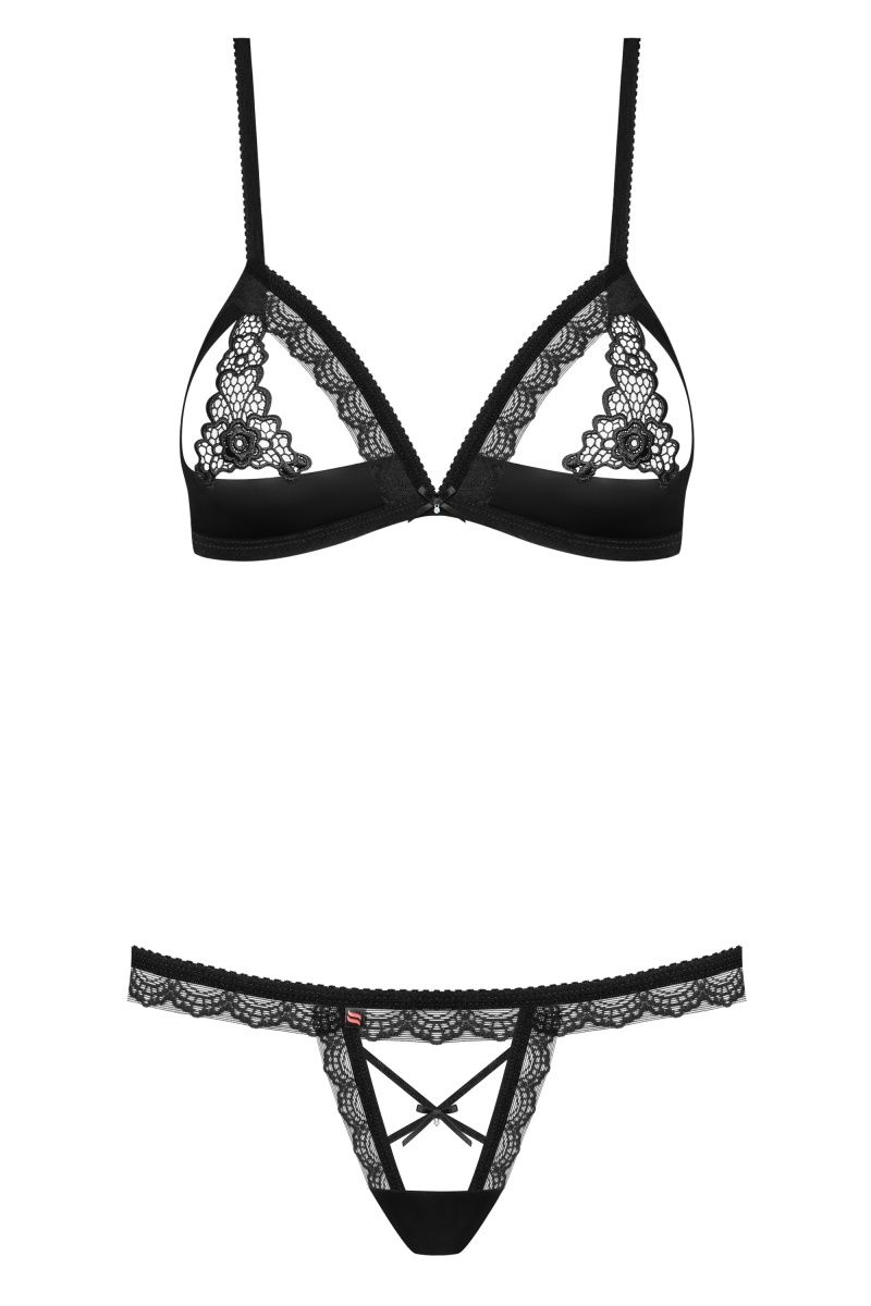 Эротический комплект белья состоит из бюстгальтера и контактных трусиков. Открытый лиф декорирован вставкой из кружева, бретели регулируются. В комплекте: бюстгальтер и трусики-стринги.