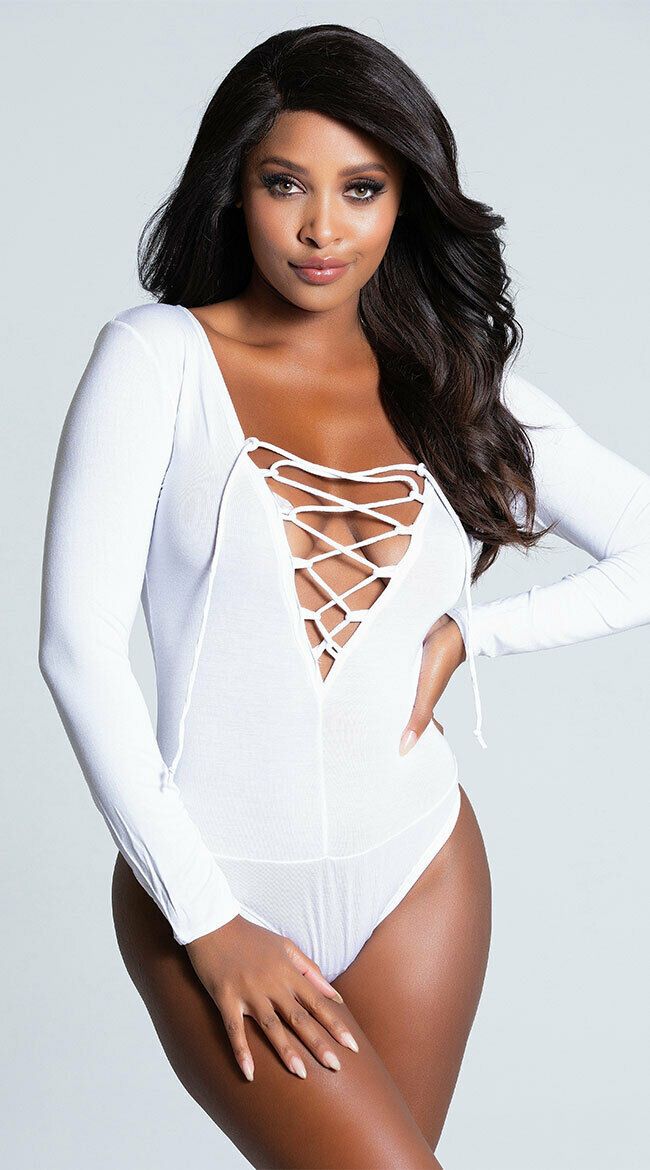 Боди с длинными рукавами, закрытой спиной и шнуровкой спереди.