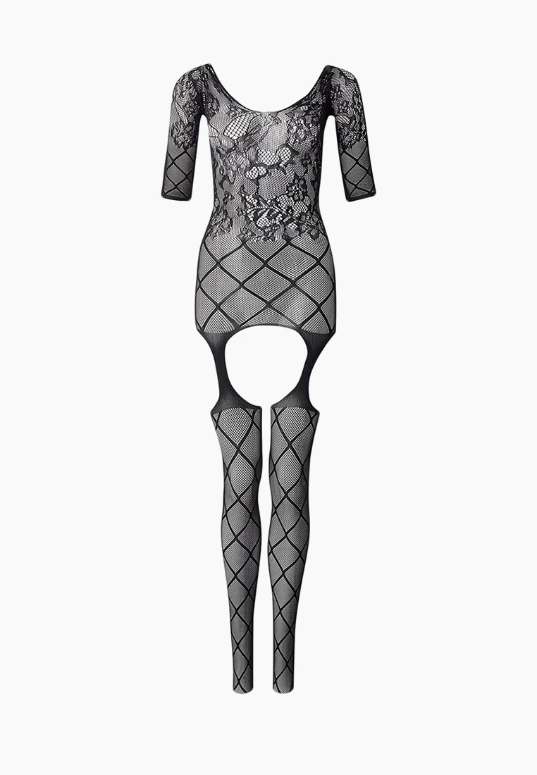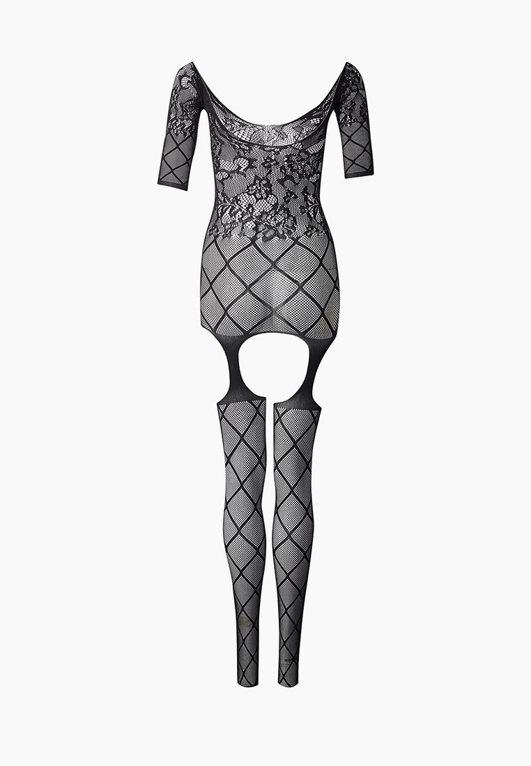 Чёрный комбинезон с ажурной верхней частью и имитацией крупной сетки снизу. С интимным доступом. Трусики не входят в комплект!