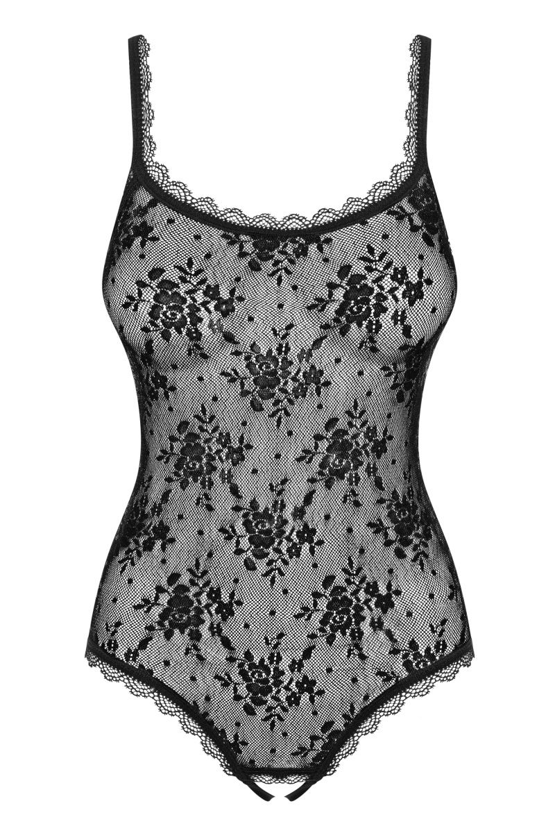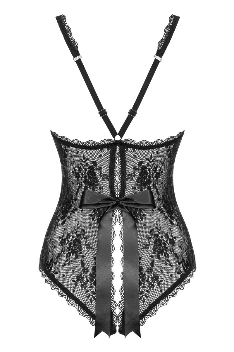 Эффектное контактное боди Rebella выполнено из эластичного кружева с цветочным узором. Сзади пикантный разрез, доходящий до уровня талии, украшен атласным бантиком. Бретельки регулируются.