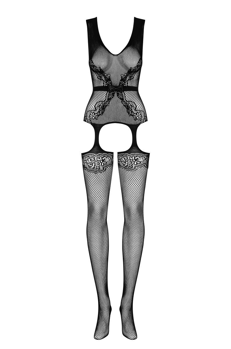 Полупрозрачный кэтсьюит с ажурным узором. Вырезы в области бедер открывают взору самые пикантные места.