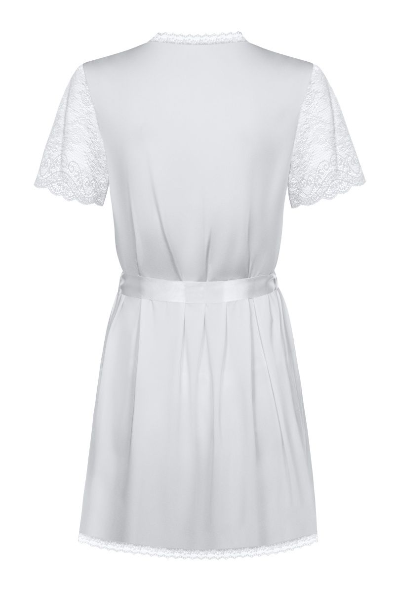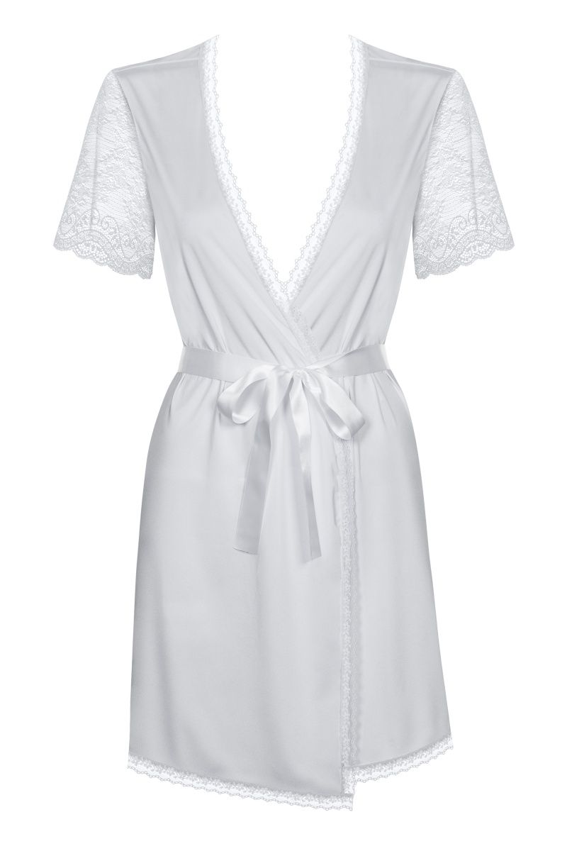 Пеньюар из стрейч-атласного материла, обрамлен кружевом, рукава выполнены из кружевного полотна с цветочным рисунком. В качестве пояса атласная лента. В комплекте: пеньюар, трусики-стринги.