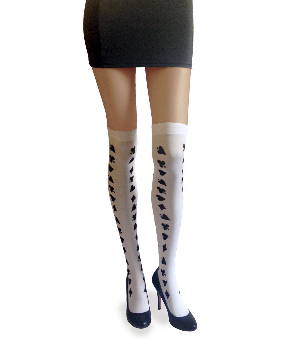 Эти белоснежные чулочки с узором в виде карточных мастей пригодятся вам не раз: и в спальне, и далеко за её пределами. Увидев вас в них, любимый поймёт, что сегодня его ждёт рискованная игра. Особенно, если в дополнение к чулкам будет идти костюм Дамы Пик или Треф…