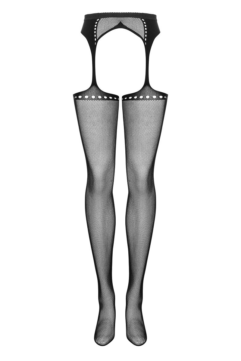 Женские чулки на поясе в мелкую сеточку с рисунком сзади.