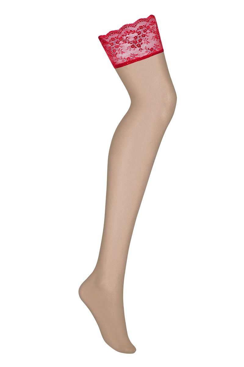 Телесные чулки Lovica с красной кружевной резинкой. Кружева с цветочным мотивом.