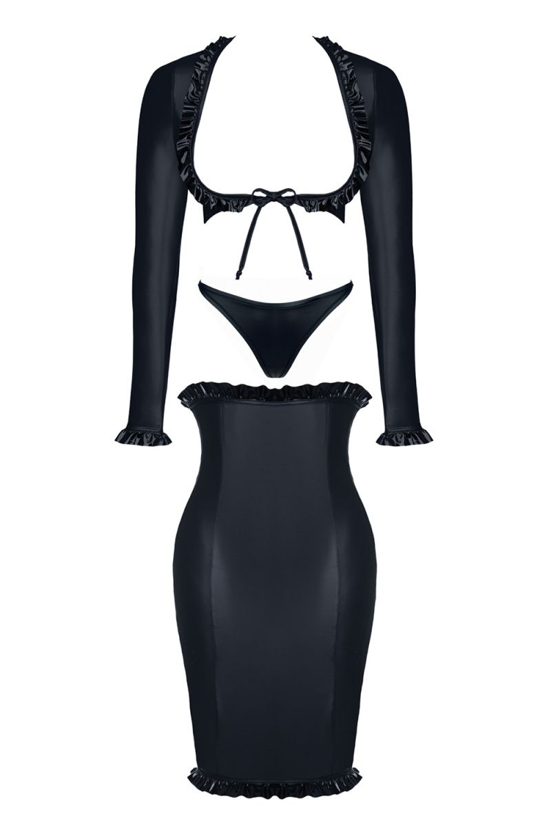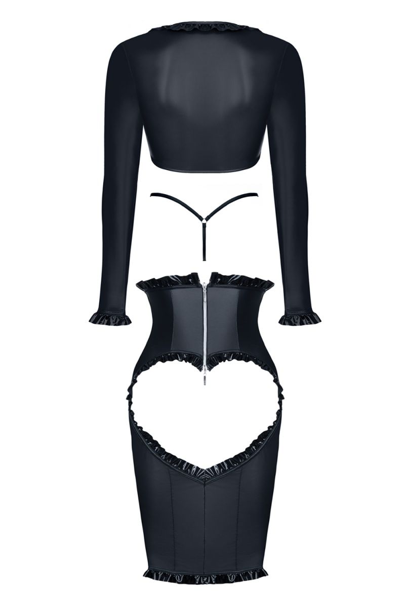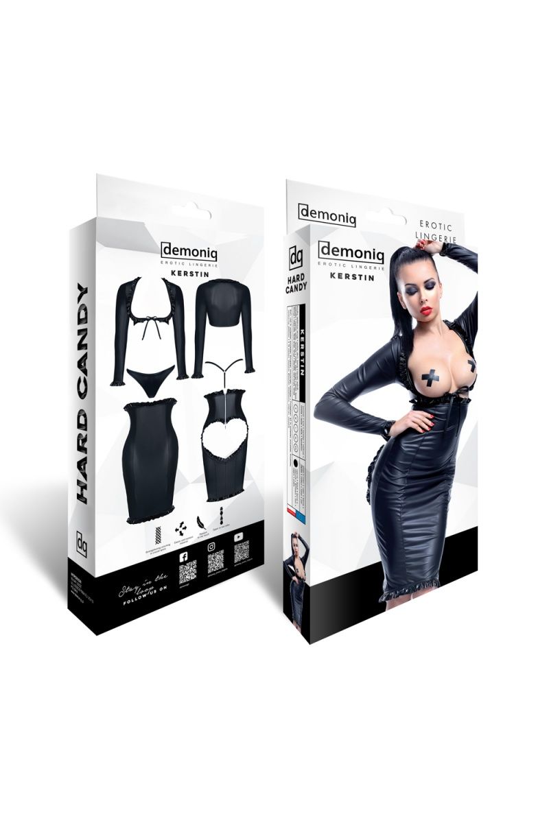 Kerstin – это соблазнительное платье, побуждающие к властным и провокационным играм. Комплект состоит из длинной юбки и болеро, эффектно подчеркивающим грудь благодаря окантовке из ткани с «мокрым» эффектом. Юбка полностью изготовлена из эластичного материала, что позволяет изящно подчеркнуть силуэт, а благодаря уникальному крою – визуально уменьшить талию. Но самая пикантная часть – находится сзади. Вырез в форме сердца позволяет насладиться видом аппетитно подчеркнутых ягодиц, а глянцевый материал, из которого выполнена окантовка – не позволит отвести от вас взгляд. Так же в комплект входят стринги с низкой талией, которые идеально дополнят ваш образ. Весь комплект выполнен в единой стилистике, с использованием одинаковых материалов и фурнитуры из металлического сплава, что позволяет выглядеть ему как единое целое. В комплекте: болеро, трусики-стринги, юбка.
