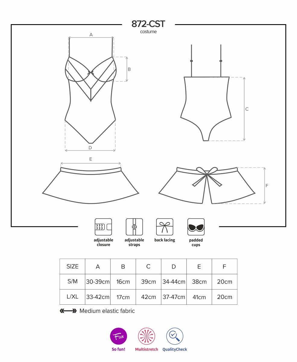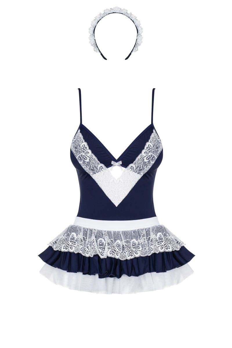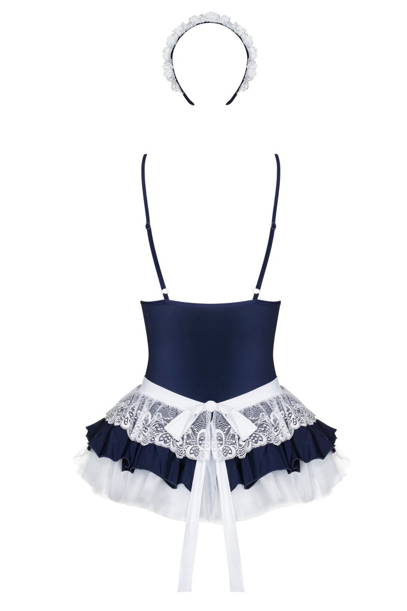 Эротический костюм состоит из боди, фартука и головного убора. Боди с регулируемыми бретелями и вырезом под грудью. Костюм декорирован кружевом. В комплекте: боди, фартук и головной убор.