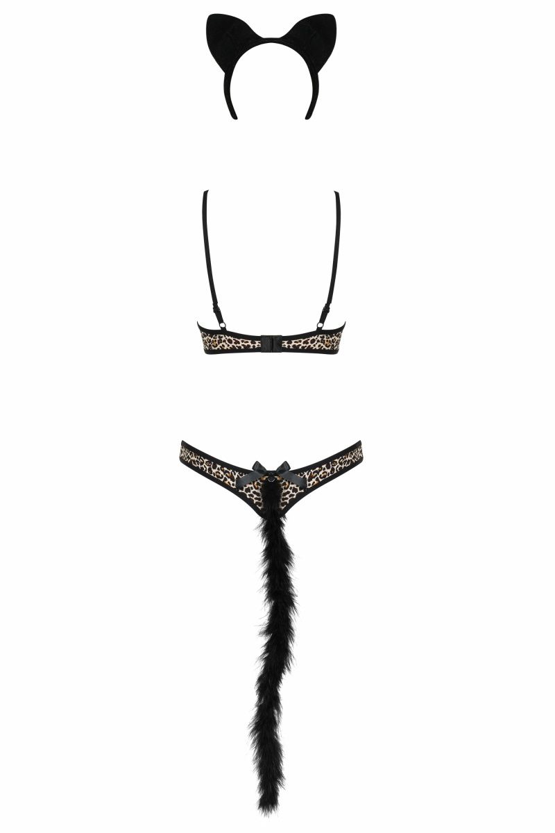 Игривый комплект белья Cheetia с хищным принтом. Лиф на косточках, украшен мехом, бретельки и застежка на спинке регулируются. В комплекте: бюстгальтер, трусики-стринги, ободок с ушками и хвостик. Чулки в комплект не входят!