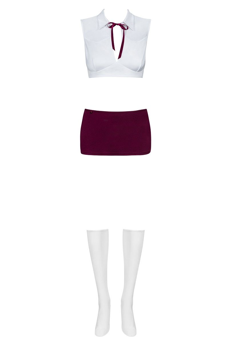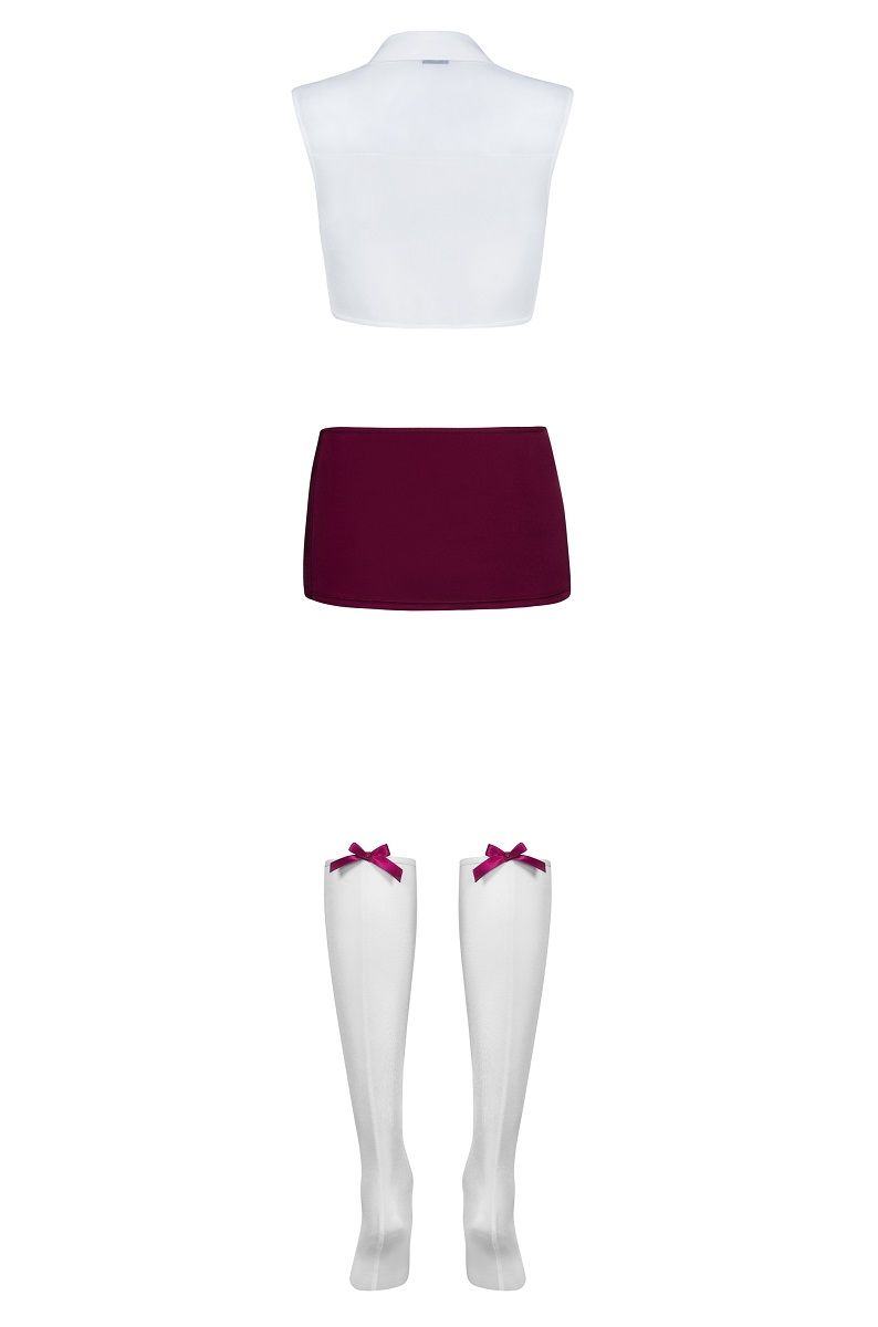 Соблазнительная форма студентки, в комплект входит белый топ с глубокой линией декольте, мини-юбка насыщенного розового цвета, трусики и белые гольфы, украшенные атласными бантиками. В комплекте: топ, юбка, трусики-стринги, гольфы.