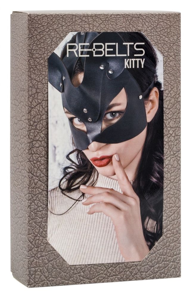 Черная маска кошечки из кожи. Изящная и достойная, для смелых духом людей. Украшена серебряными заклёпками. Застегивается на тоненькие ремешки под нужный размер. Размеры маски - 19 х 20,5 см.