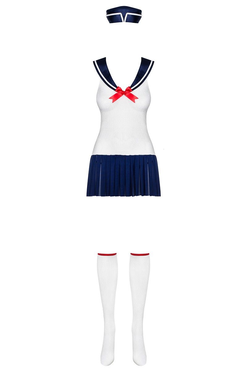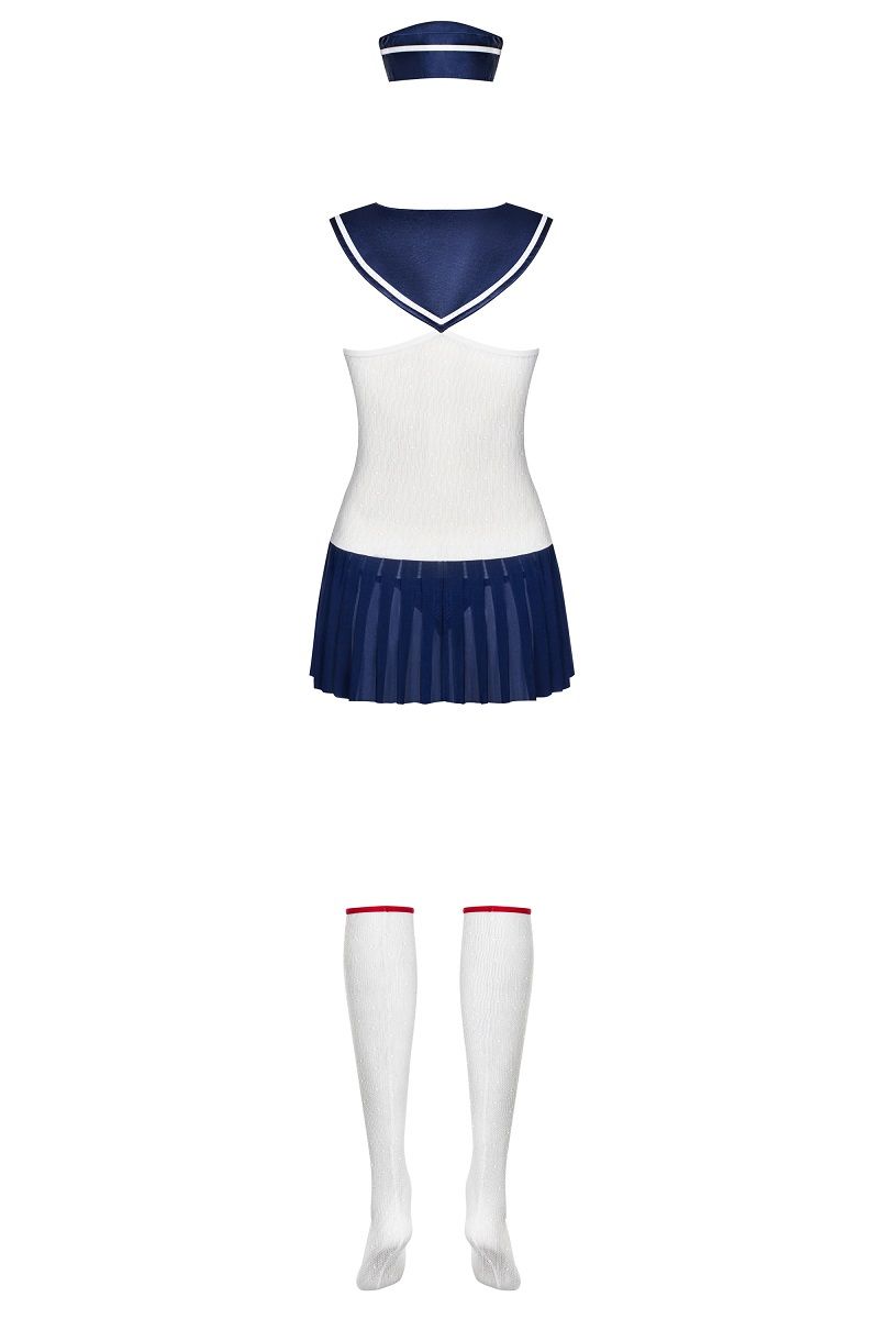 Сексуальный костюм морячки: полупрозрачное платье, гольфы, трусики-стринги и головной убор. В комплекте: платье, гольфы, трусики-стринги и головной убор.