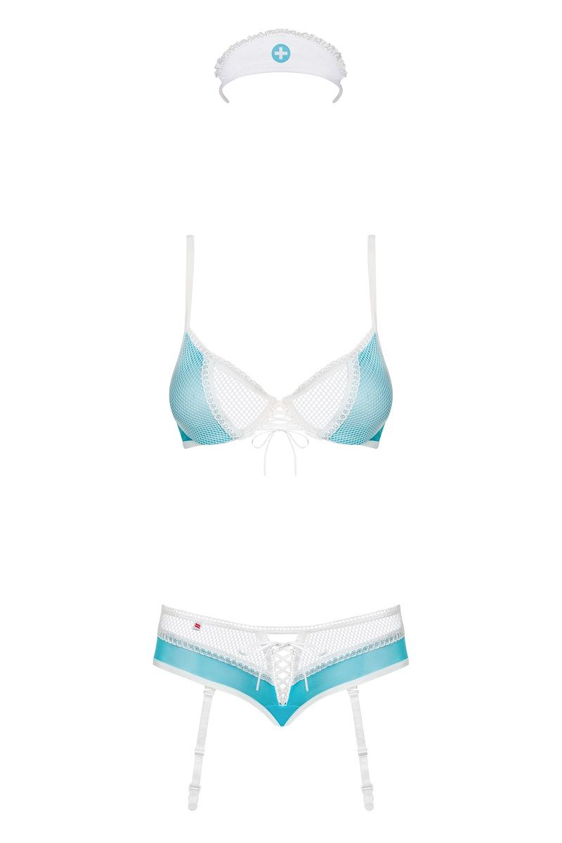 Соблазнительный комплект медсестры из сетки. Можно надевать комплект без чепчика, просто в качестве соблазнительного наряда. В комплекте: чепчик, лиф, трусики с пажами.