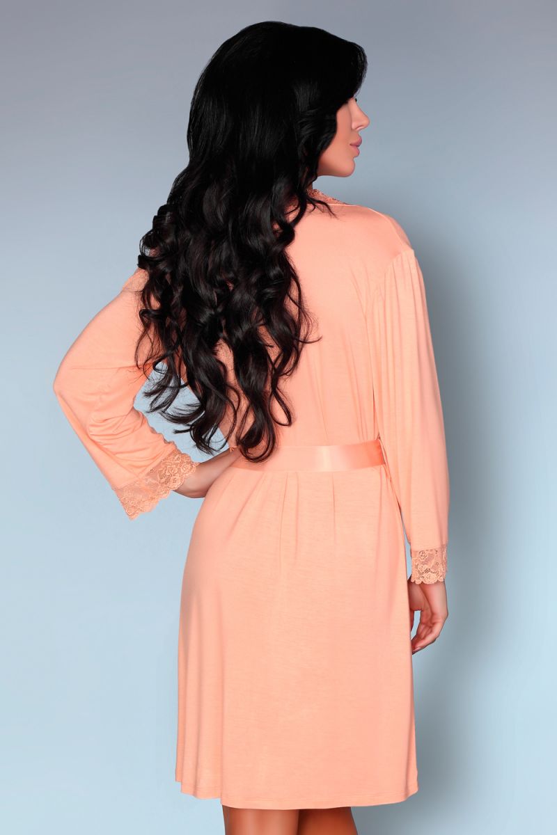 Пеньюар из вискозы нежного пастельного цвета, отделка кружево с цветочным рисунком. Пояс из атласной ленты.