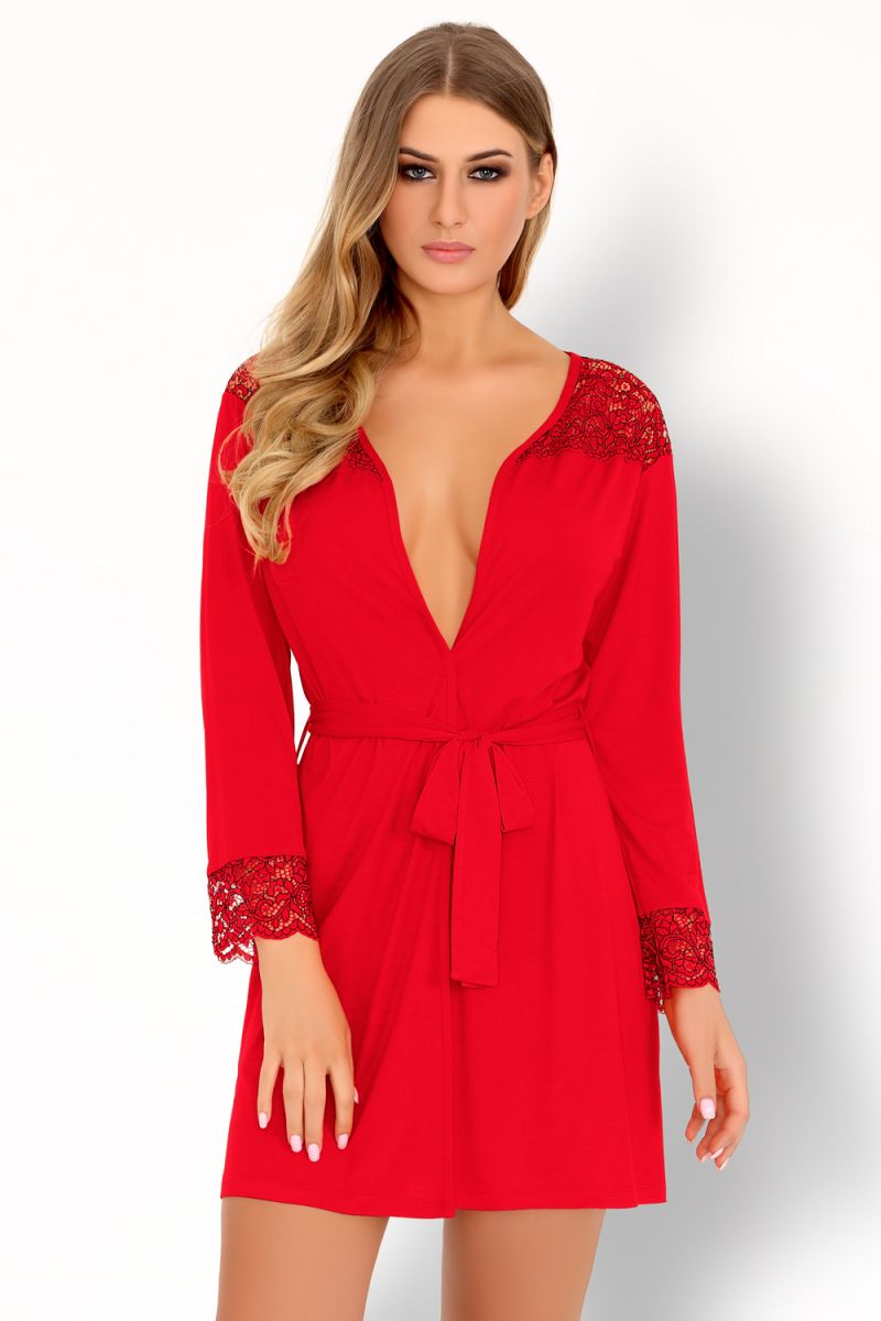 Короткий пеньюар подчеркивает длину ног и выделяет женскую фигуру. Глубокое декольте акцентирует внимание на груди. Халатик выполнен из приятной к телу вискозы с небольшим содержанием эластана. Рукава и плечи декорированы кружевом в тон. Пеньюар завязывается на запах на талии с помощью пояса. В комплекте: пеньюар и трусики-стринги.