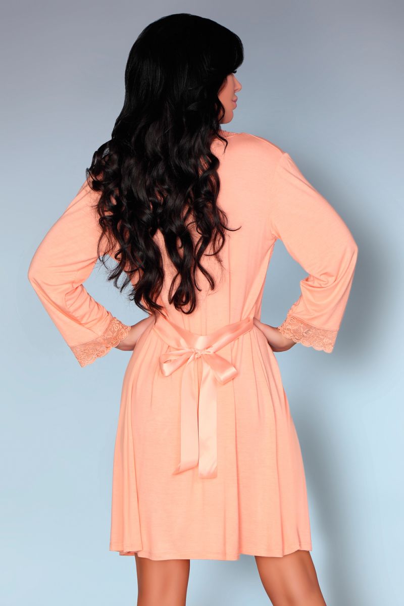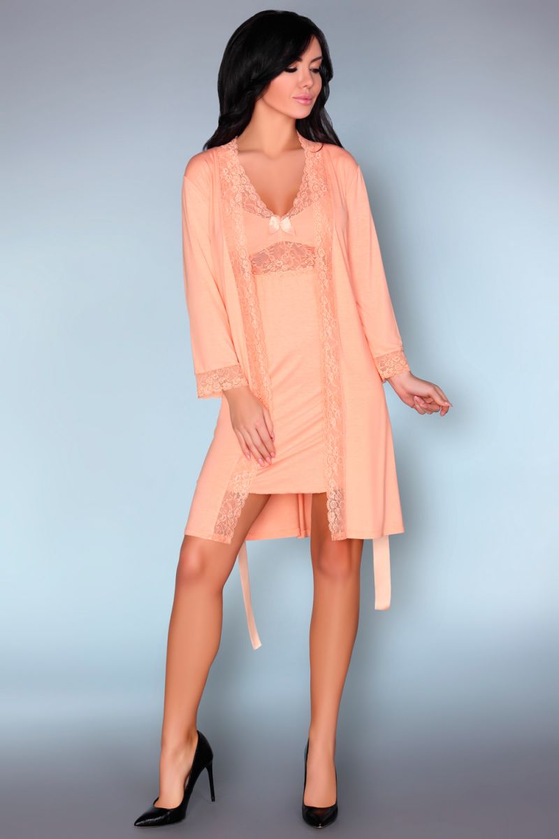 Нежный комплект из вискозы. Пеньюар и сорочка декорированы кружевом с цветочным рисунком, пояс из атласной ленты. В комплекте: сорочка, пеньюар.