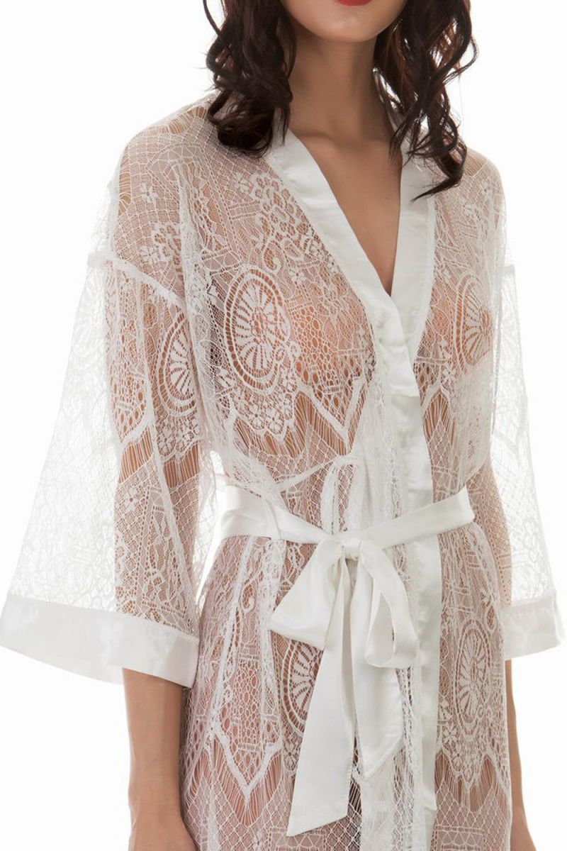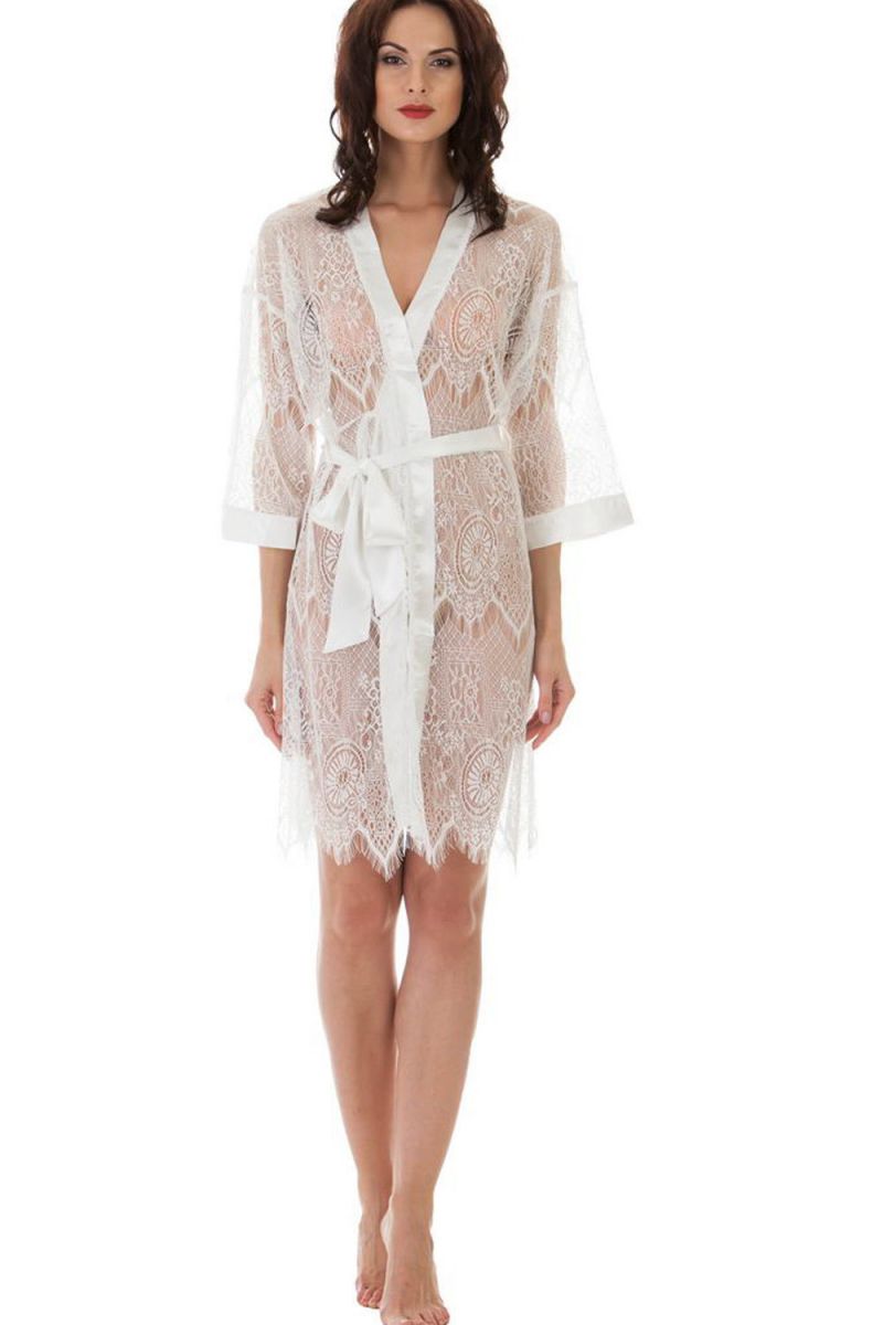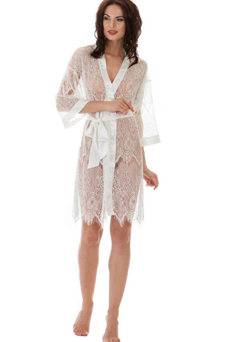 Короткий халат прямого силуэта выполнен из кружева. Модель по борту и горловине на обтачке из атласа, по талии завязывается на внутреннюю завязку. Широкий спущенный рукав на атласном манжете, создающий воздушный образ.