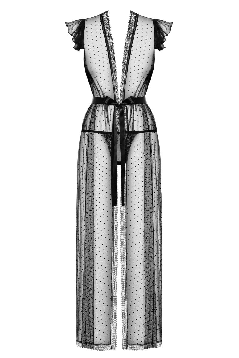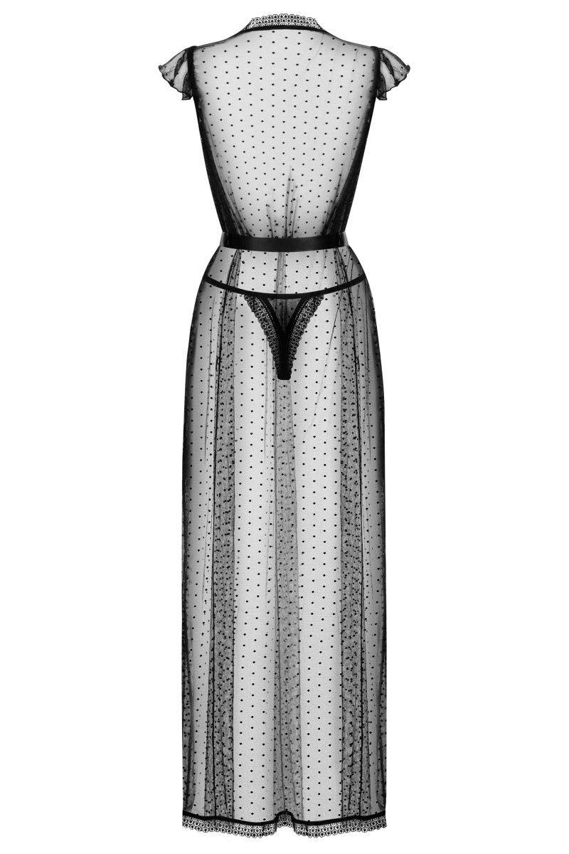 Полупрозрачный длинный пеньюар и стринги в мелкий горошек с отделкой из кружева. В комплекте: пеньюар и трусики-стринги.