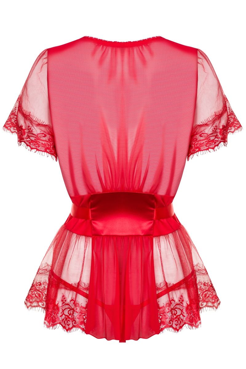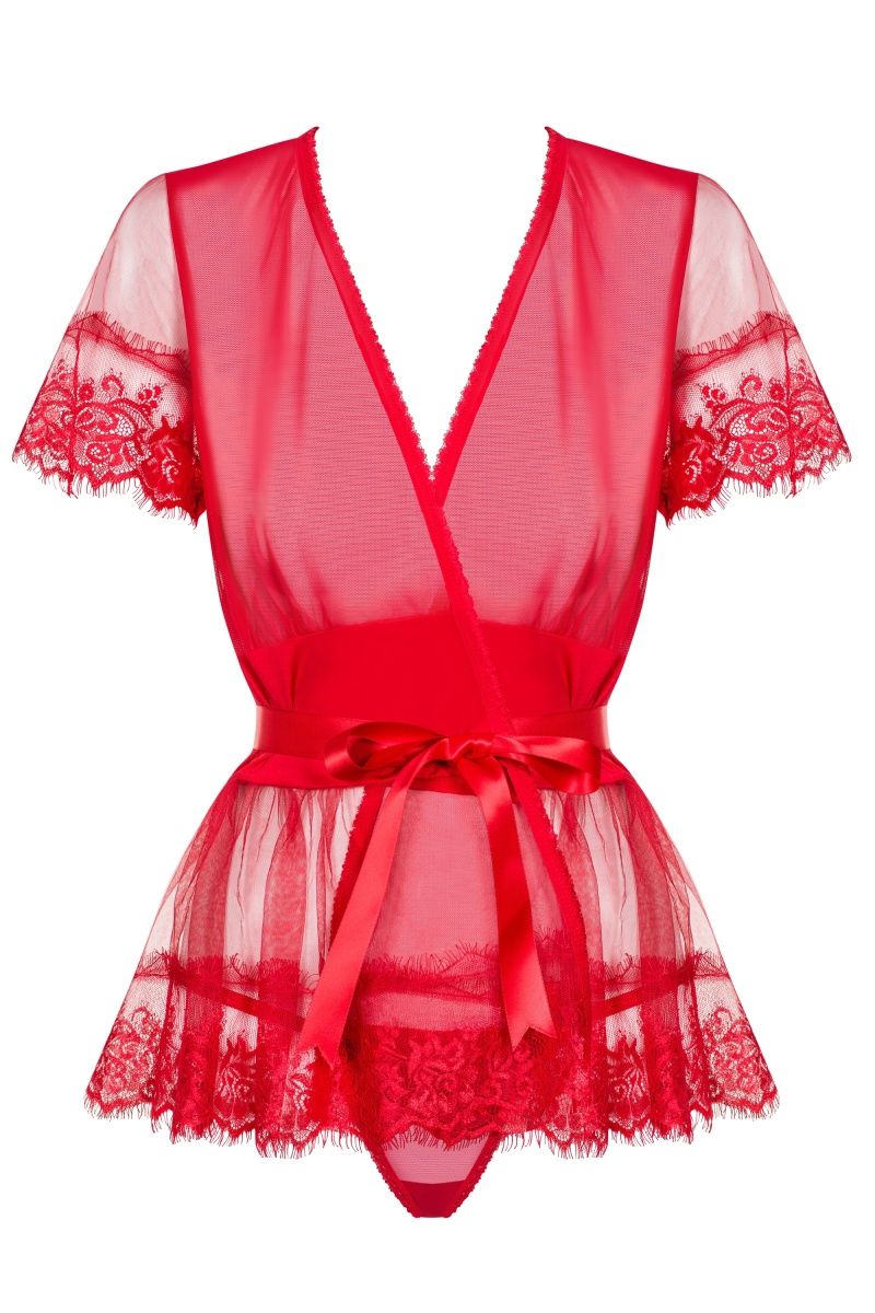 Кружевной пеньюар с атласным поясом. В комплекте: пеньюар и трусики-стринги.