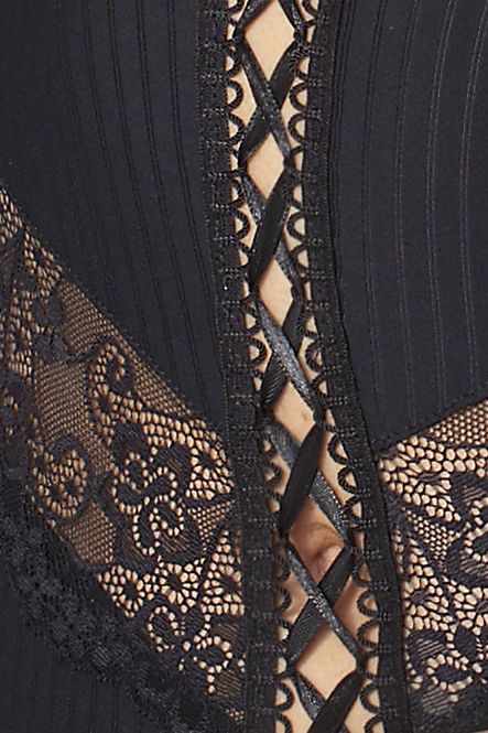 Корсаж Zoja в тонкую полоску с оборками и шнуровкой. В комплекте: корсаж, трусики-стринги.