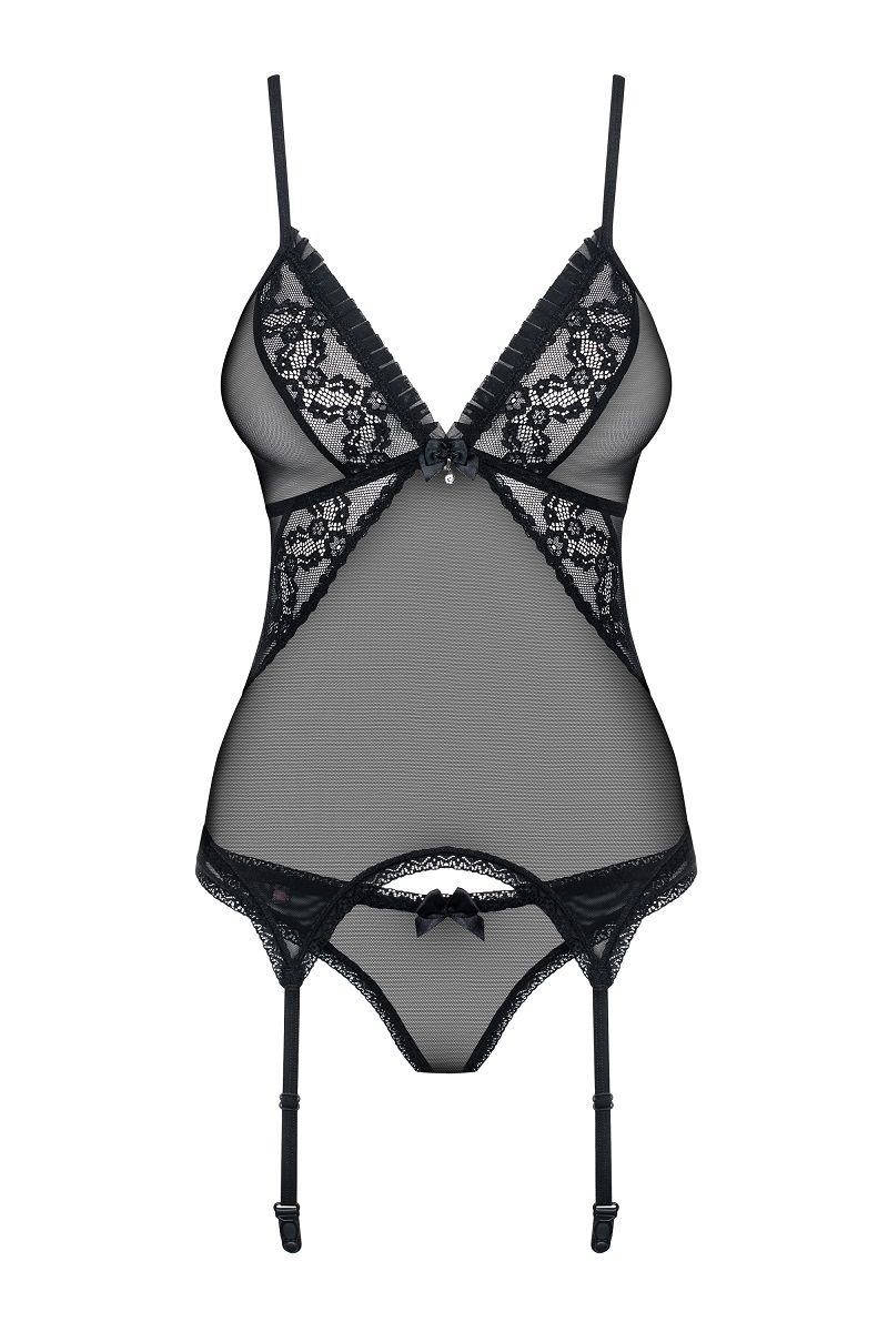 Полупрозрачный корсаж с рюшевой отделкой. В комплекте: корсаж, трусики-стринги.