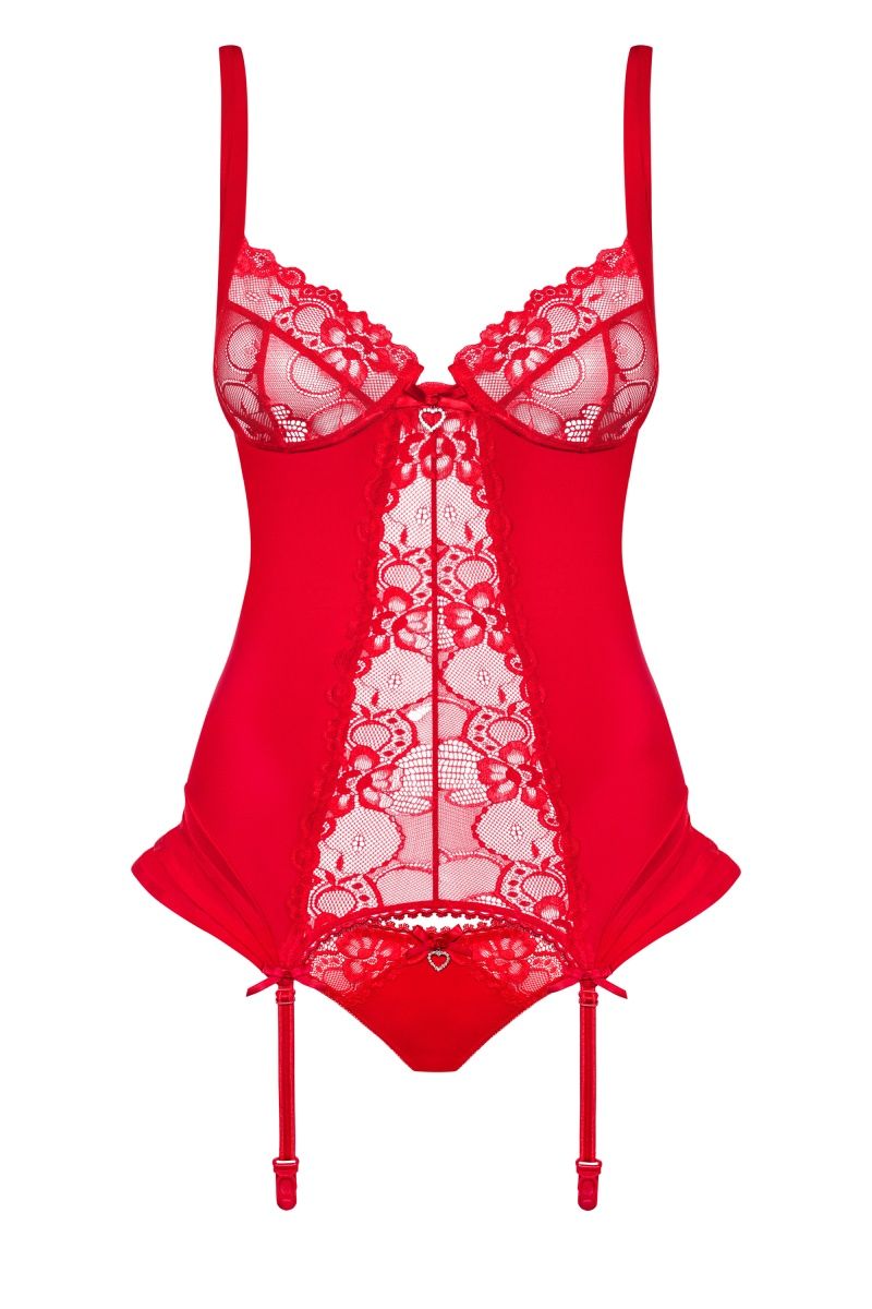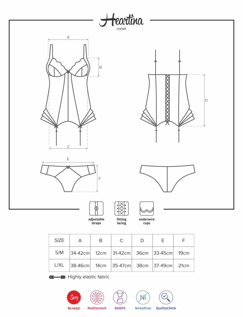 Корсаж и трусики из стрейч-атласного материала и кружева с цветочным рисунком. Корсаж и трусики украшены подвеской со стразами в форме сердечка. Чашка мягкая на косточке. Пажи для чулок регулируются по длине, отстегиваются. В комплекте: корсаж и трусики-стринги.