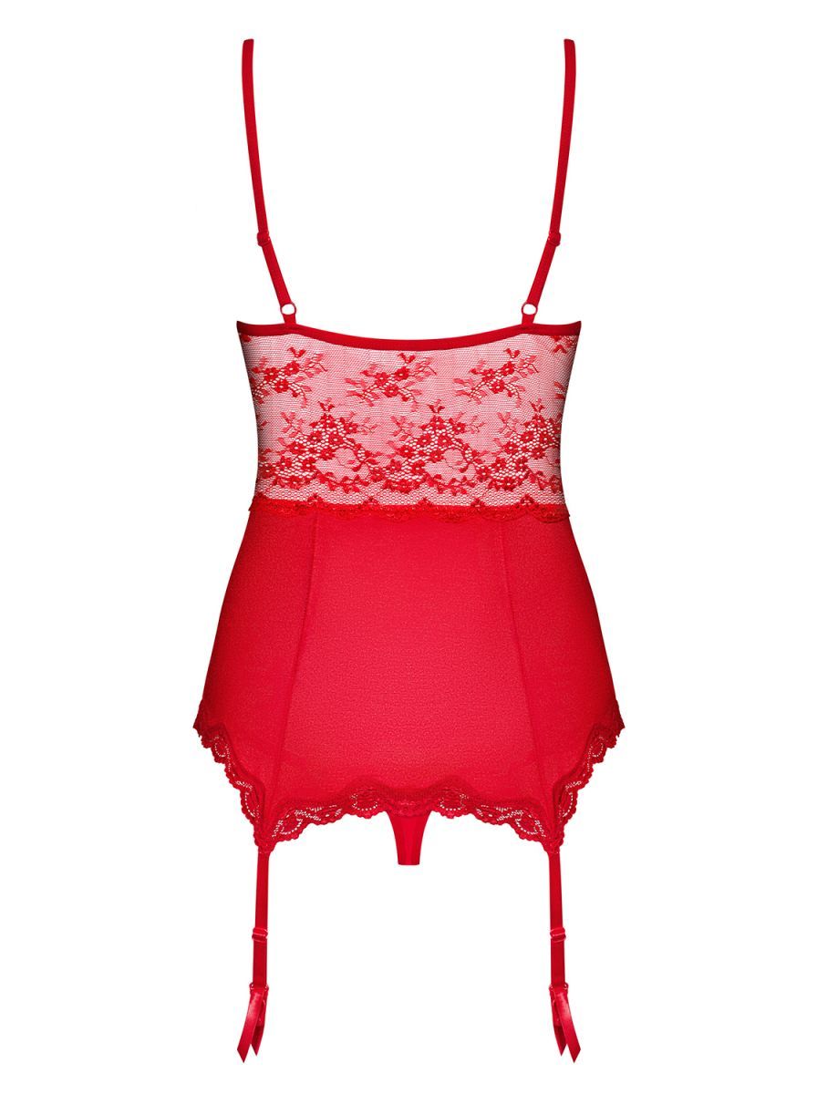 Чувственный корсаж со вставками из нежного кружева. Чашка мягкая на косточке, пажи для чулок не отстегиваются, регулируются по длине. В комплекте: корсаж и трусики-стринги.