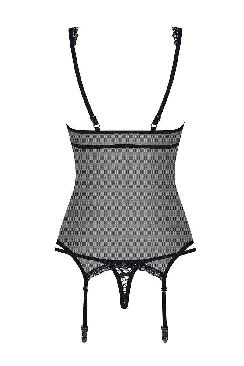 Корсаж выполнен из полупрозрачной сеточки в сочетании с красивым цветочным кружевом, бретели регулируются. В комплекте: корсаж, трусики-стринги.