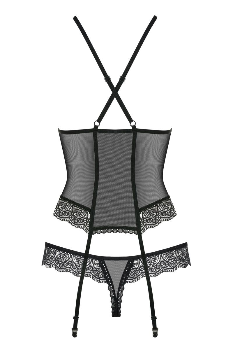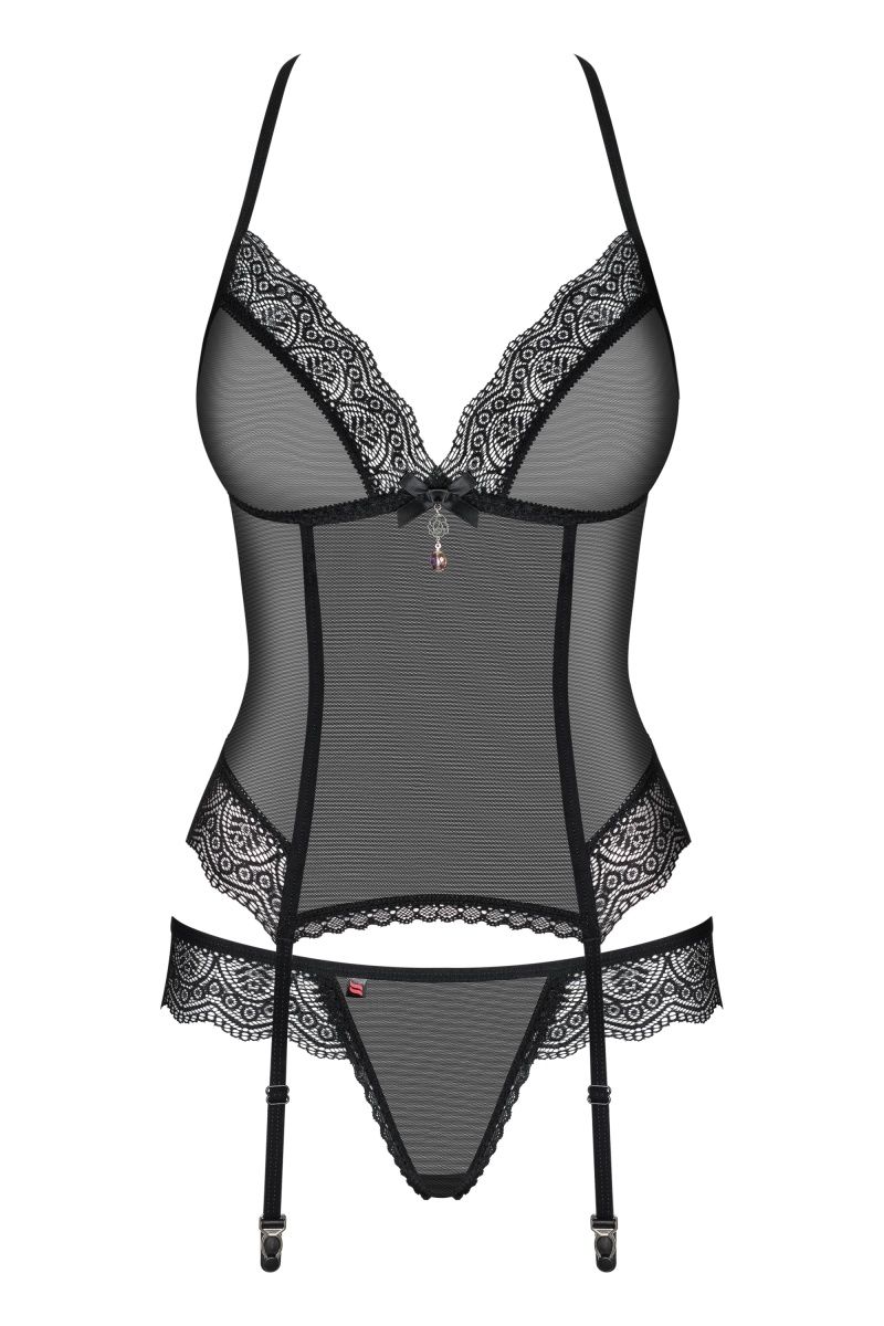 Эротический корсаж с отделкой из кружева, бретели регулируются. В комплекте: корсаж и трусики-стринги.