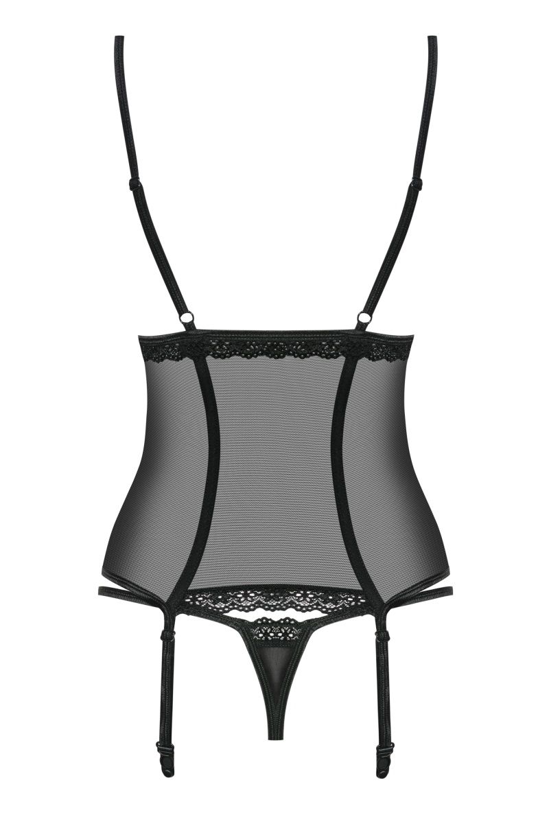 Эротический корсаж цвета выполнен из прозрачной сеточки и атласной ткани, декорирован кружевной окантовкой, бретели регулируются. В комплекте: корсаж и трусики-стринги.