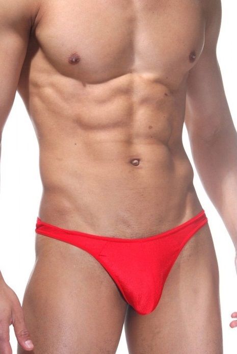 Гладкие классические мужские трусы-тонги. Яркого красного цвета, хорошо тянутся, на широкой красной резинке.