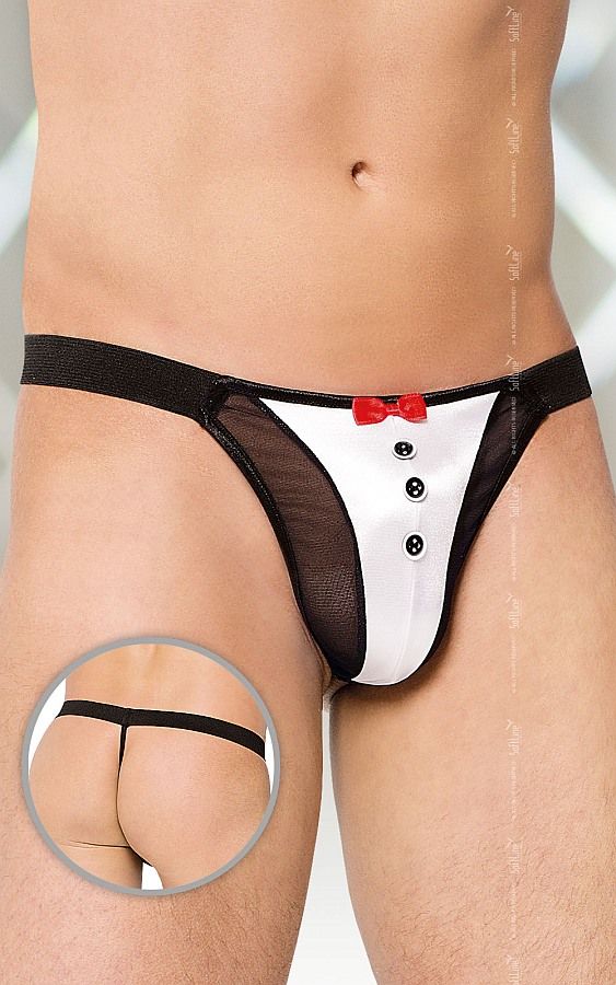 «О, милая леди! Не соблаговолите ли вы…» И на этом ваша речь прервётся, ведь леди, придя в состояние дикого возбуждения, поспешит сорвать с вас бельё. Трусики-стринг с пуговками и бантом превратят настоящего джентльмена в мужчину, с которым хочется растерять всякое приличие! Оригинальные, смелые, игривые, и при этом удивительно сексуальные трусики-стринг помогут вам внести в ежедневные ласки нотку аристократичности. Модель подходит как для соблазнительного приватного танца или ролевой игры, так и для жаркого вечера с любимой. Три пуговочки концентрируют внимание на мужском достоинстве, которое сводит с ума своими объемами.