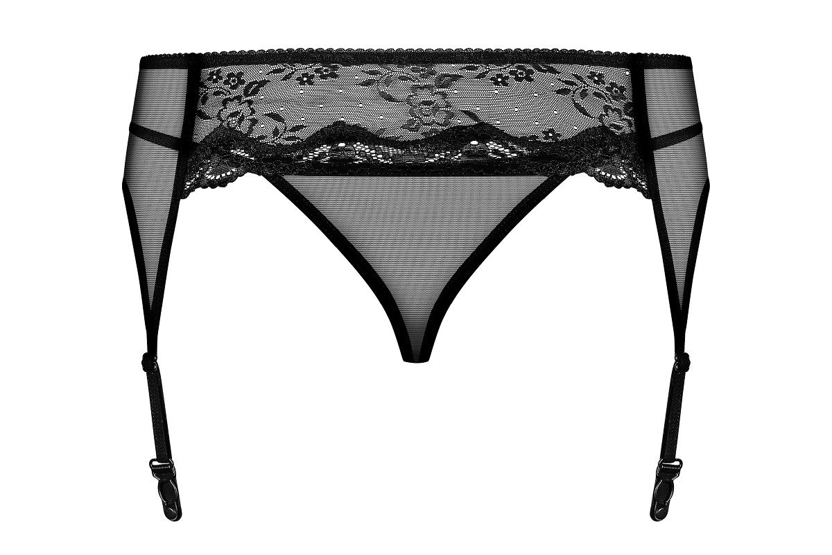 Элегантный пояс для чулок со стильным мотивом. Цветочное кружево на передней и задней части пояса, украшен сверкающими камнями. Трусиик-стринги в комплекте. В комплекте: пояс для чулок, трусики-стринги.