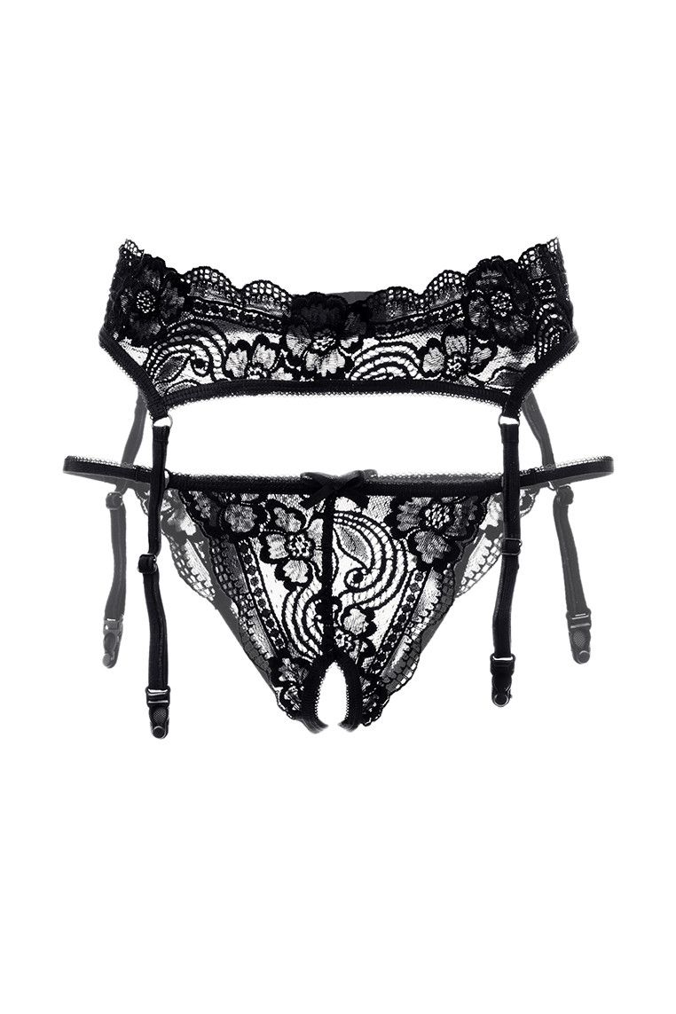 Эротический комплект из пояса для чулок и кружевных эластичных трусиков. Трусики с атласными бантиками. Пояс с ажурным верхним краем, на регулируемой застежке. В комплекте: пояс, трусики с открытой попкой.