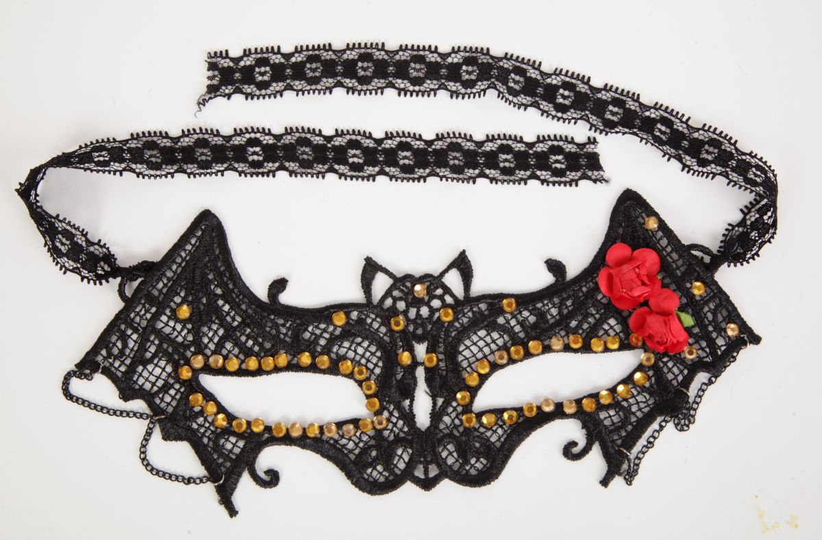 Карнавальная маска - летучая мышка. Украшена многочисленными стразами и красными розочками. Завязывается на кружевные ленты. Упаковка- картонный конверт. Размеры - 21 х 10 см.