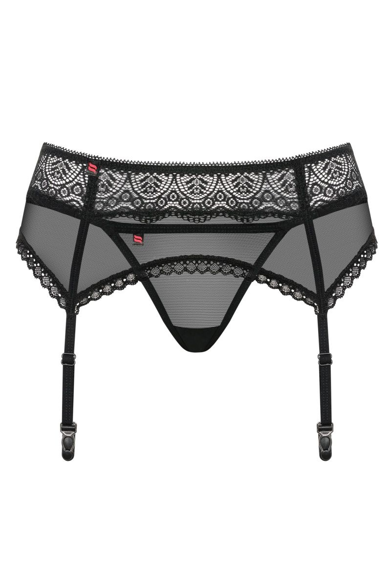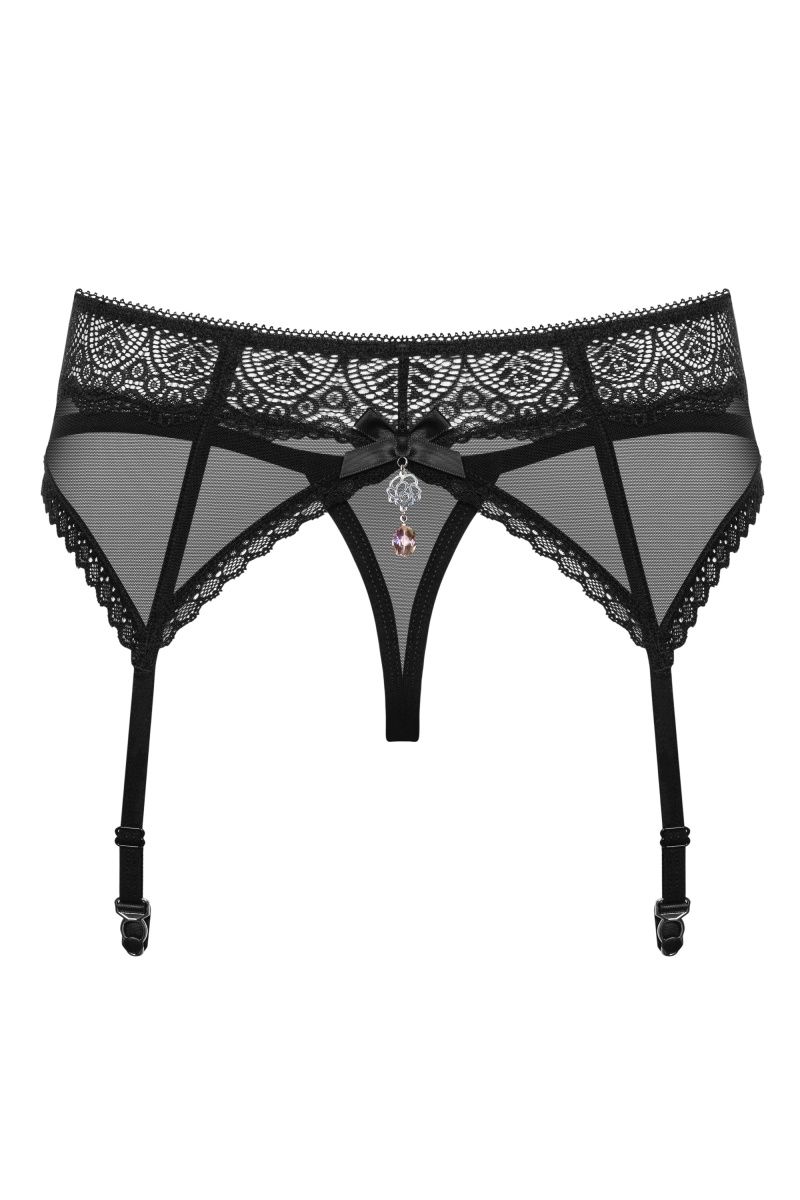 Пояс для чулок с кружевным декором и регулируемыми подвязками. В комплекте: пояс для чулок и трусики-стринги.