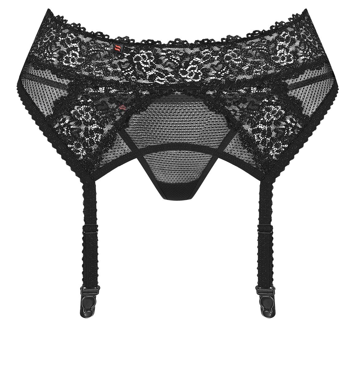 Пояс выполнен из эластичной сеточки в сочетании с красивым кружевом. В комплекте: пояс, трусики-стринги.