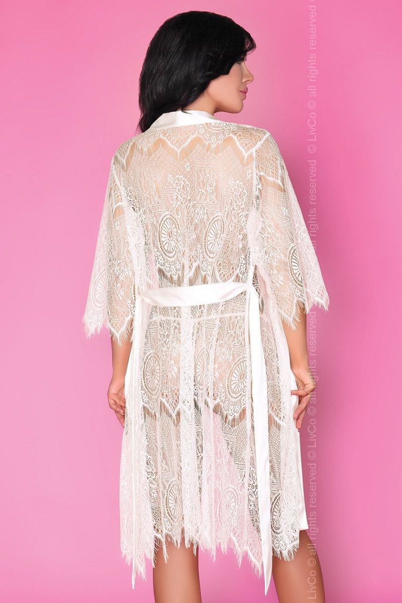 Нежный комплект: кружевной пеньюар с запахом, полы пеньюара обрамлены атласным материалом. Приталенная сорочка на тонких бретелях и трусики. В комплекте: пеньюар, сорочка, трусики-стринги.
