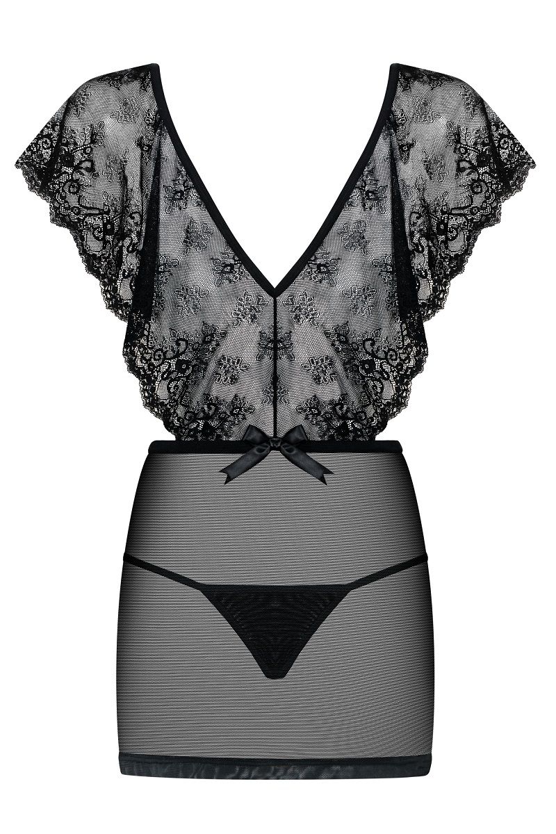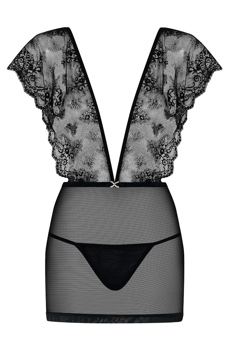 Эффектная сорочка Merossa с широкими кружевными бретелями и прозрачным подолом. Трусики-стринги в тон в комплекте. В комплекте: сорочка, трусики-стринги.
