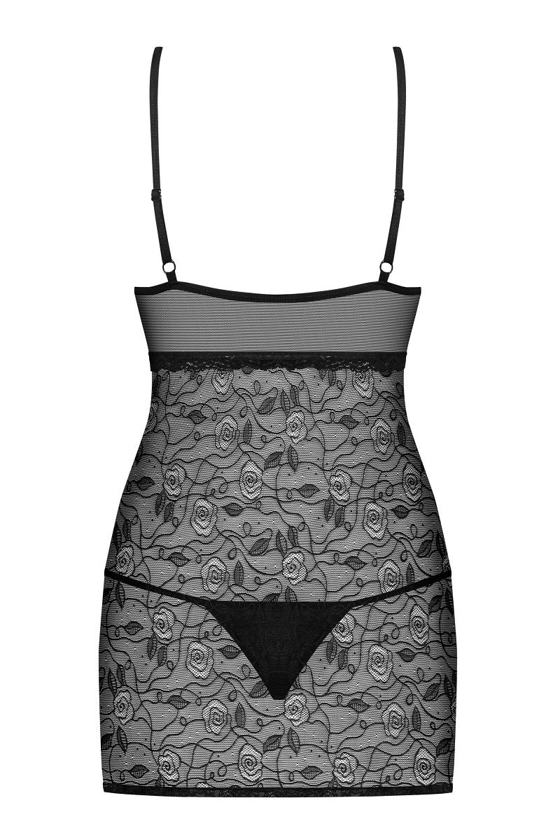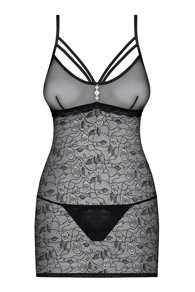 Элегантная полупрозрачная сорочка с приталенным силуэтом, зона декольте украшена стразами и лентами. В комплект входят трусики. В комплекте: сорочка, трусики-стринги.